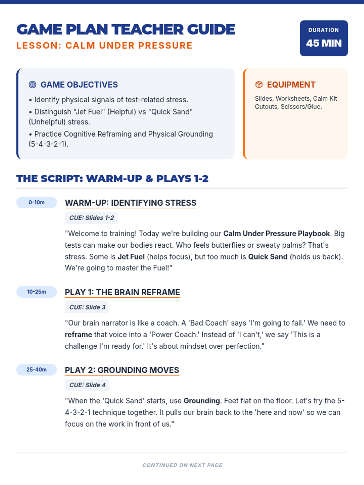 A detailed teacher guide and script for 'The Calm Under Pressure Playbook' lesson, including learning objectives, a minute-by-minute pacing guide, and specific grounding scripts for the classroom.