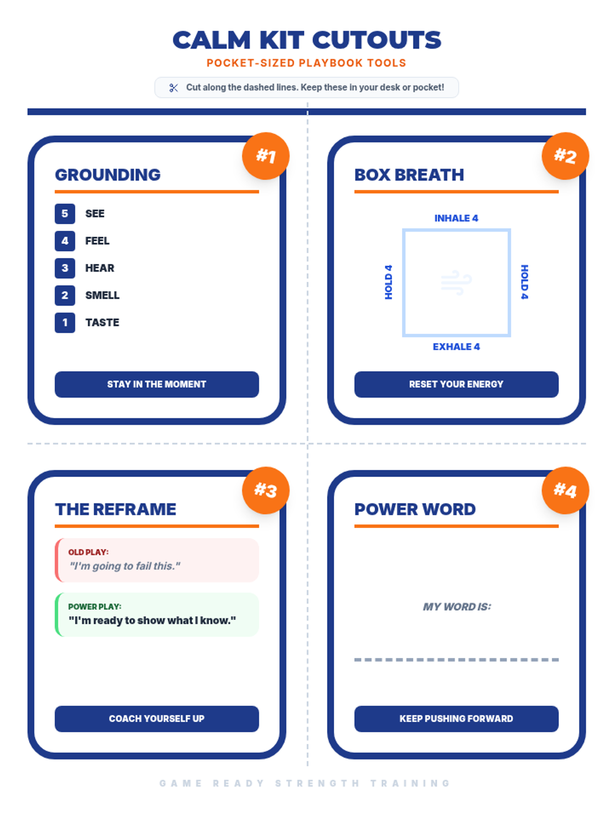 A set of pocket-sized 'Calm Kit' cards for 4th graders, featuring grounding techniques, box breathing instructions, and reframing reminders to be used during assessments.