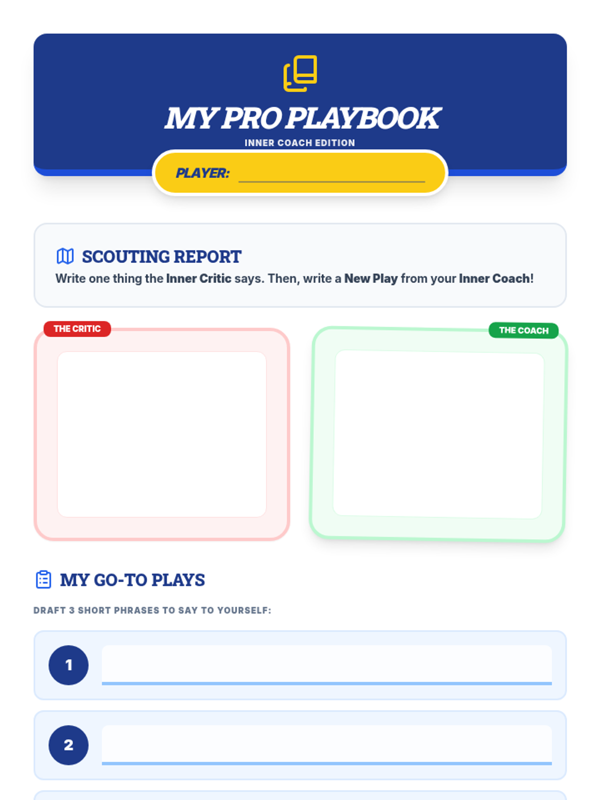 A student activity sheet where they create their personal 'Inner Coach Playbook' by identifying their inner critic and writing supportive replacement affirmations.