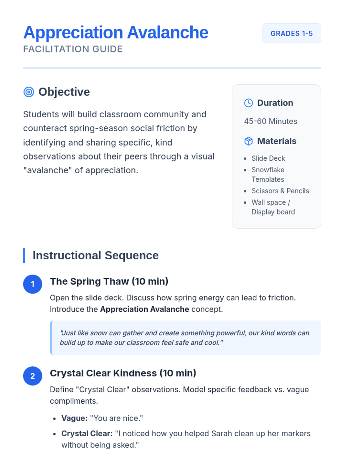 A comprehensive facilitation guide for the Appreciation Avalanche lesson, including objectives, materials, a step-by-step instructional sequence, and deep-dive discussion prompts. Fixed page-breaking and text contrast issues.