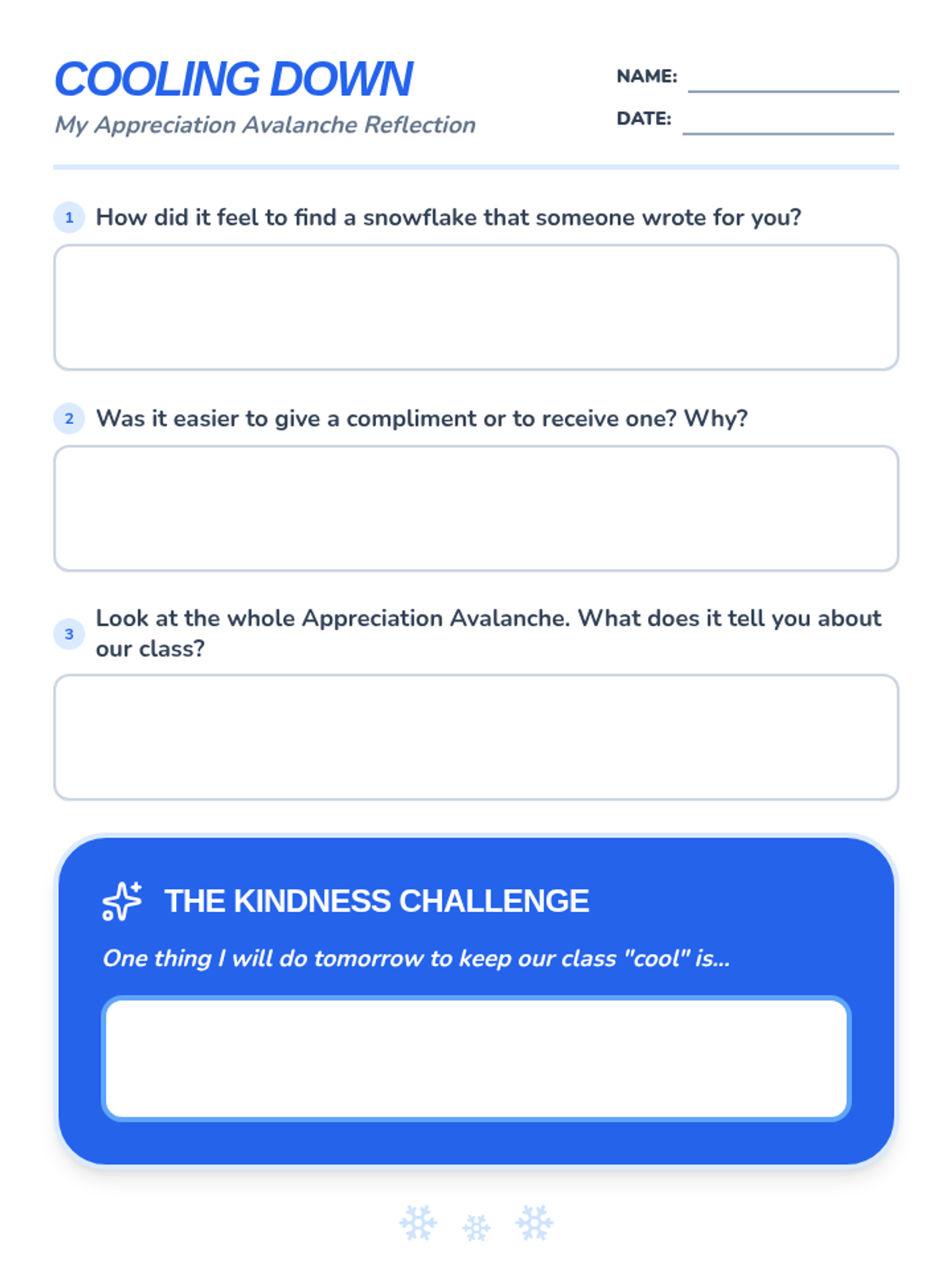 A student-facing reflection worksheet for the Appreciation Avalanche lesson. Redesigned to fit on a single page with high-contrast answer areas and fixed layout. Increased font weights and response box sizes.