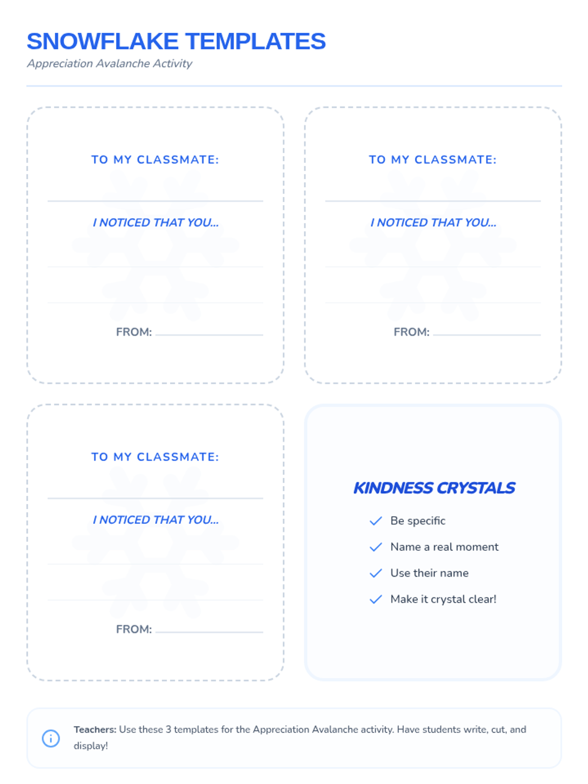 Printable snowflake templates for students to write 'Crystal Clear' appreciations. Redesigned to fit all templates on a single page with improved contrast and handwriting space. Increased font sizes for elementary students.