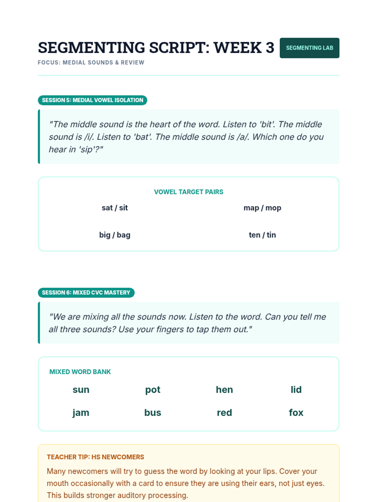 A comprehensive teacher-facing script and oral word bank for the 10-session Phoneme Segmenting Intervention, featuring specific prompts for finger tapping and sound isolation. Includes mixed pre/post assessment banks.