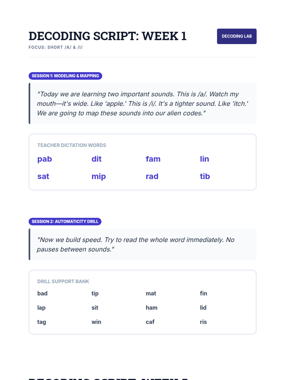 A comprehensive teacher-facing script and word bank for the 10-session Decoding Intervention, providing explicit instruction prompts and targeted word lists for modeling. Includes master assessment word lists.