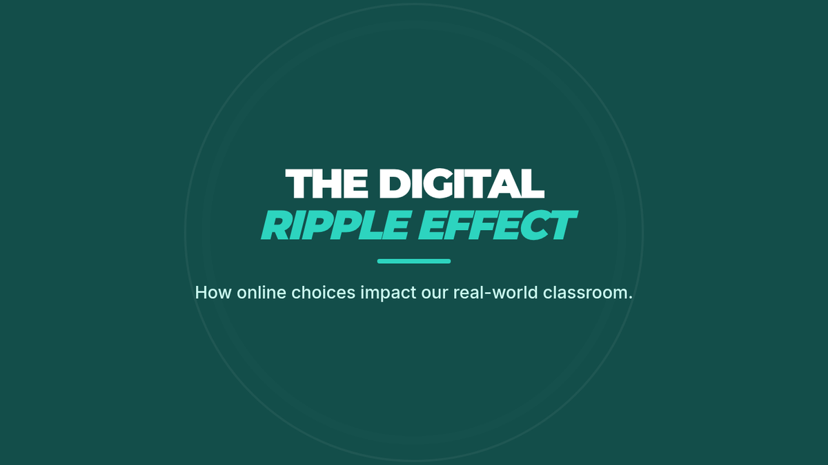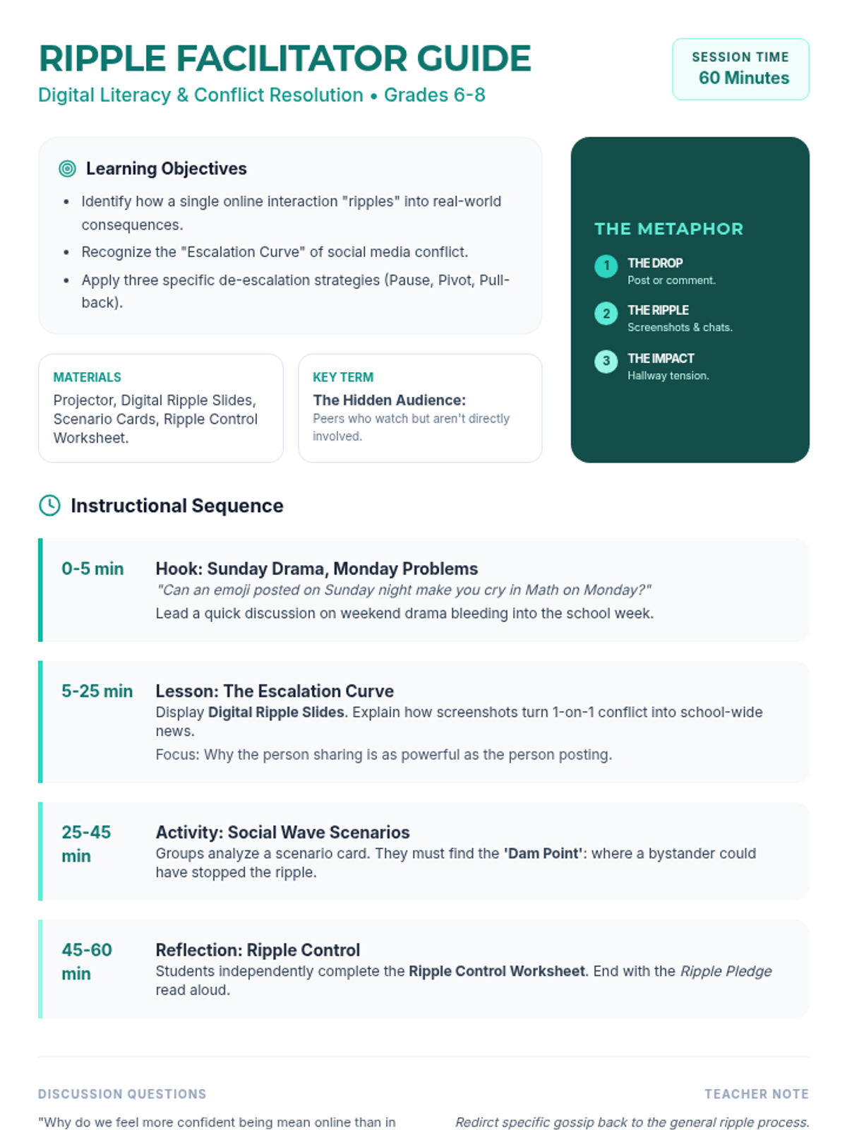 A comprehensive teacher's lesson plan for middle school grades 6-8, outlining objectives, materials, and a timed instructional sequence focused on the 'Digital Ripple Effect' metaphor.