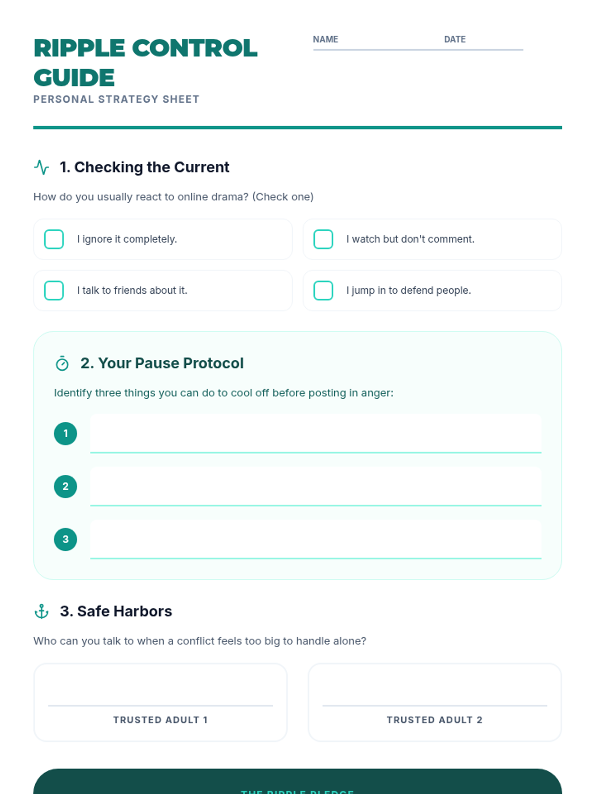 A personal reflection worksheet for students to assess their online behavior, create a 'Pause Protocol' for anger management, and identify trusted adults as 'Safe Harbors' for conflict resolution.