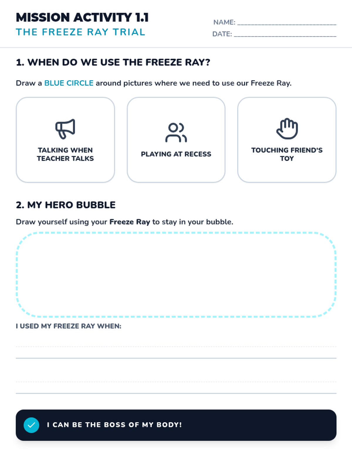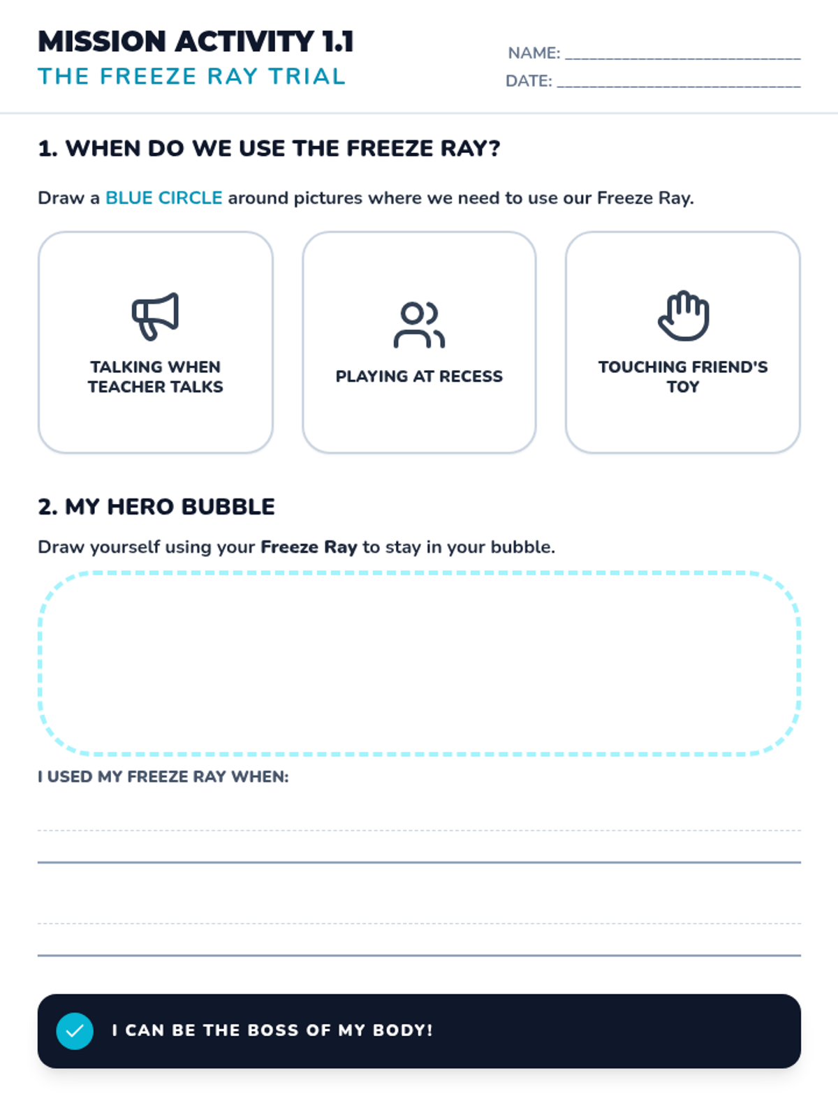 A student worksheet for the first week of Super Control Academy. Added prompt for writing lines and increased font size for young readers. Consolidated to one page. Added dashed primary lines for writing support. Increased font sizes in activity cards.