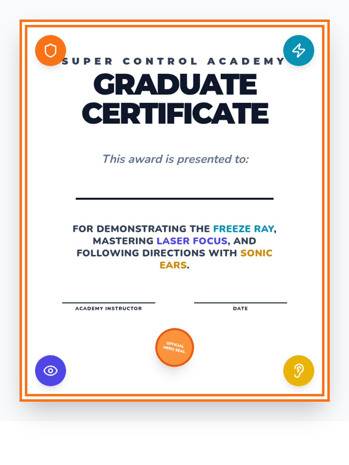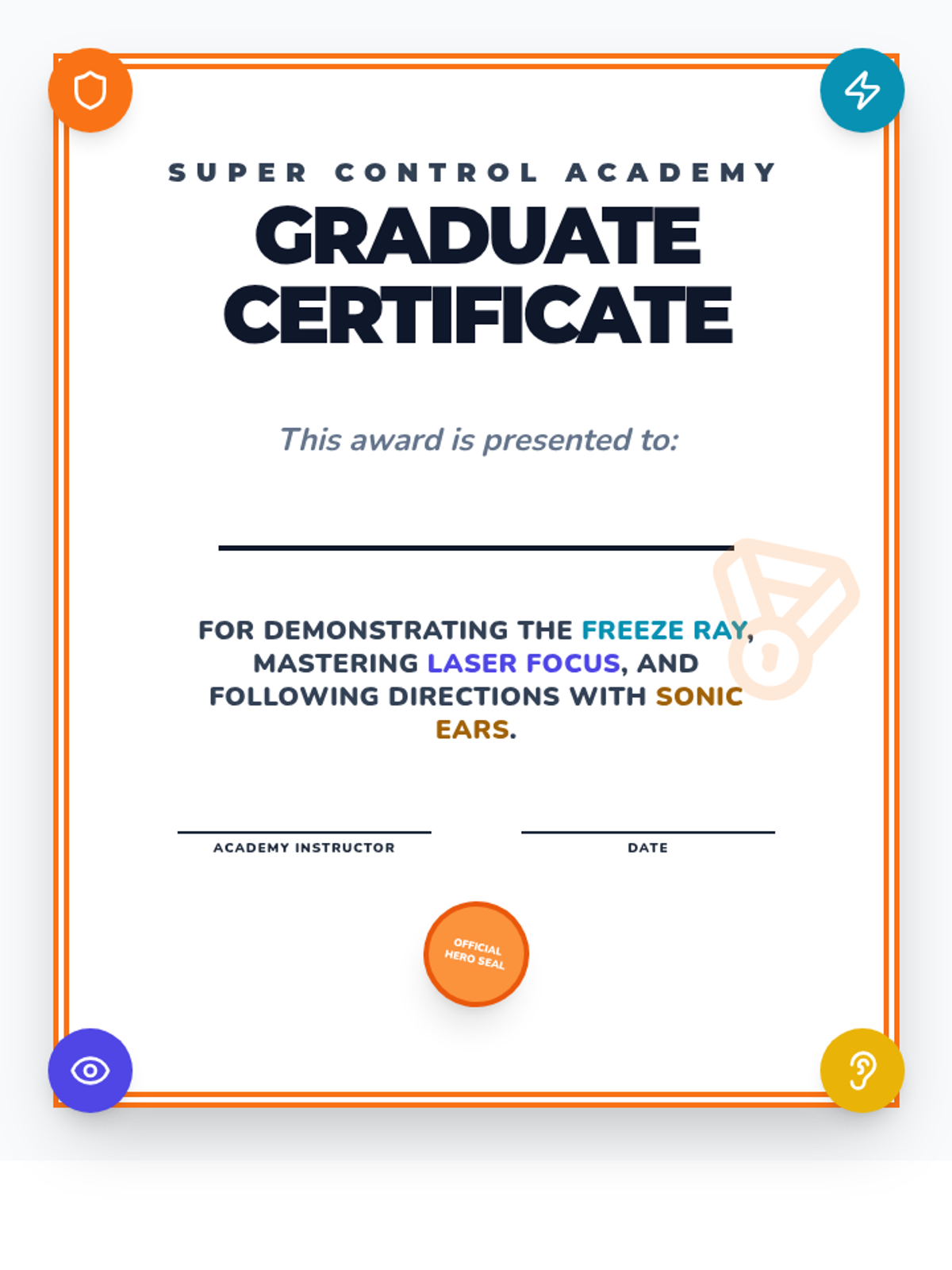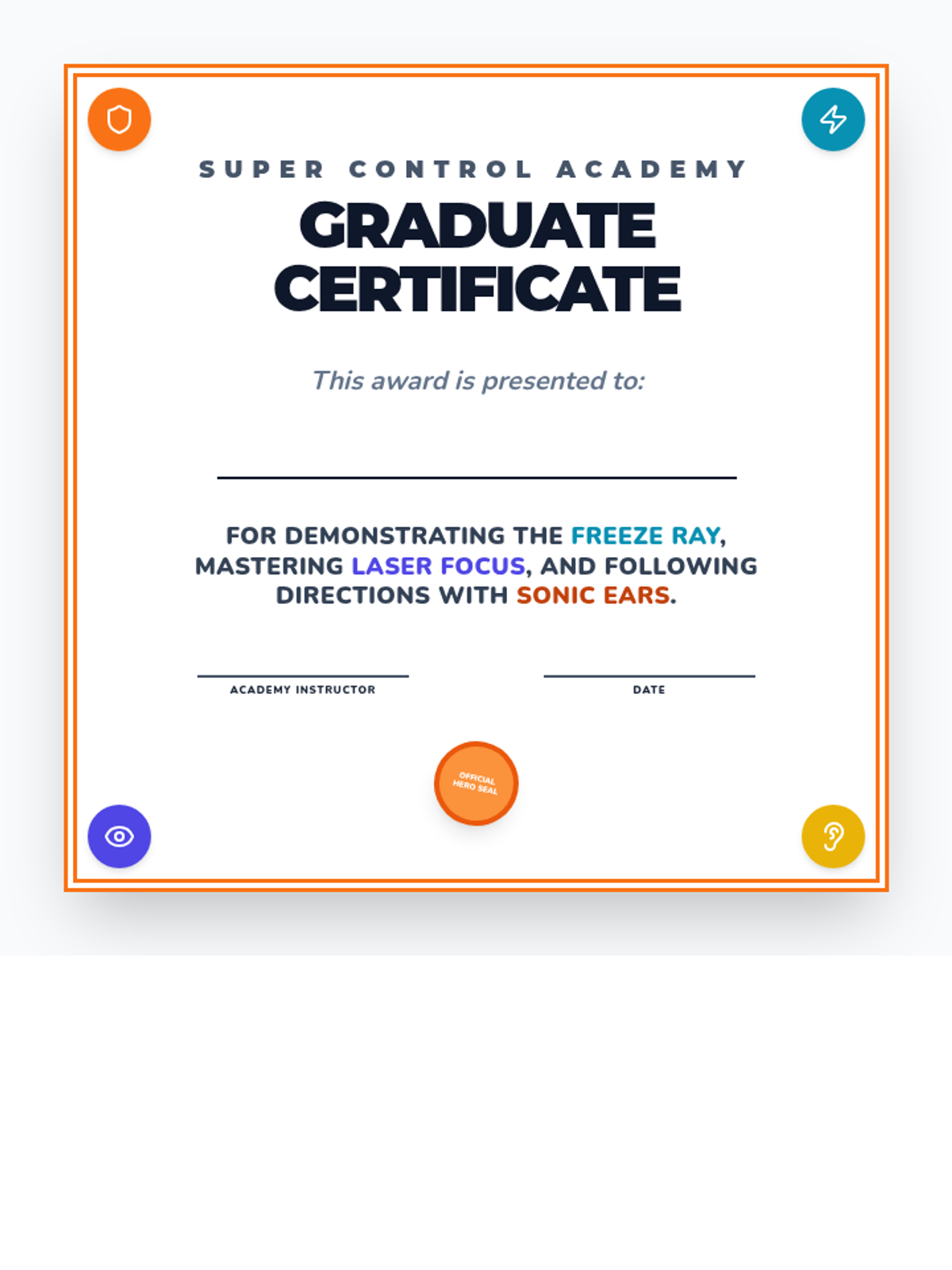 A colorful graduation certificate for students who complete the Super Control Academy. Improved layout to prevent overlap and ensure all icons are visible. Improved contrast for terms. Improved border and icon positioning.