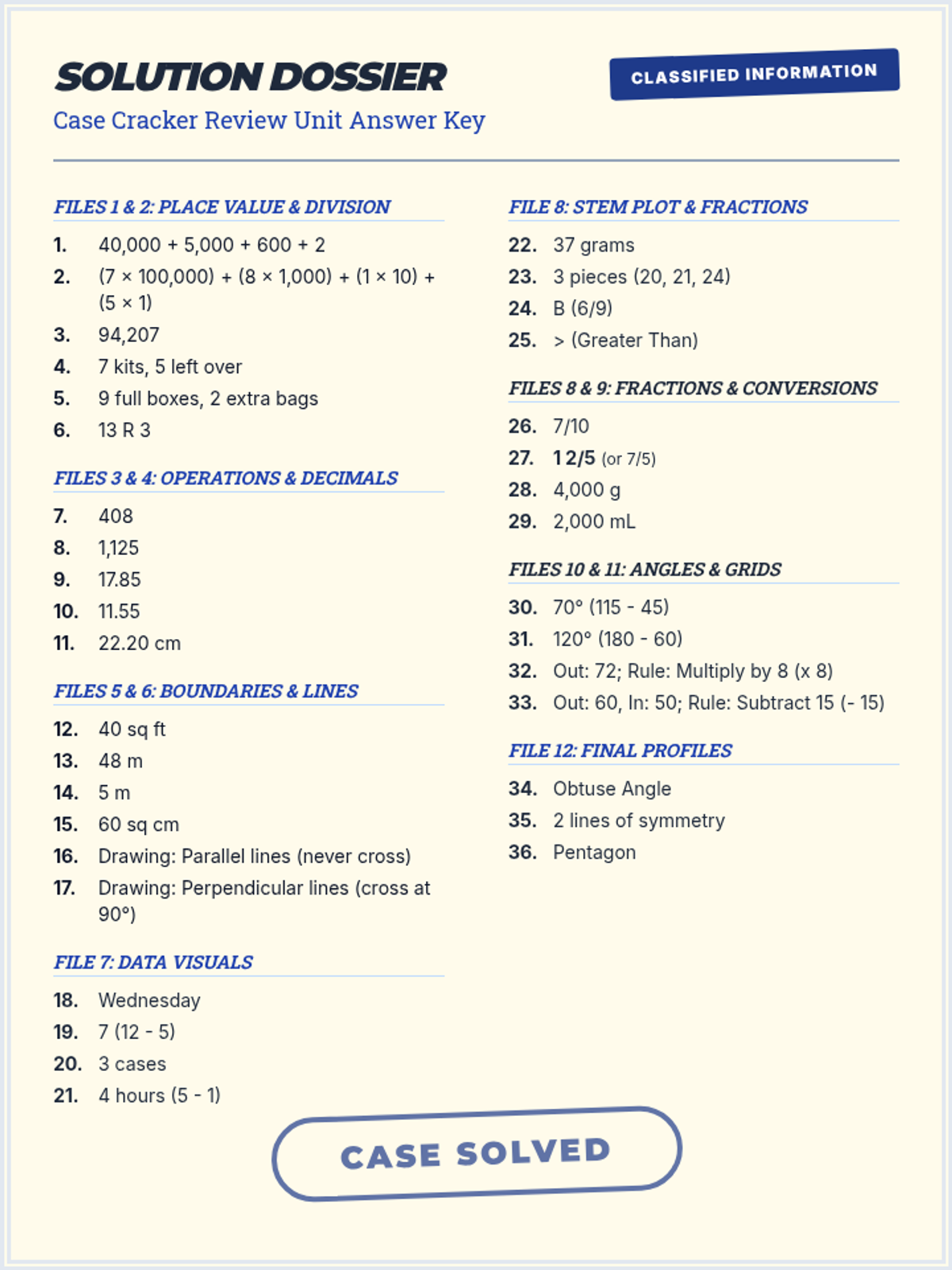 The complete answer key for the 'Case Cracker Review Unit' math packet. Organized by Evidence File for quick grading, providing solutions for all 36 questions across operations, fractions, geometry, and data standards. Updated to match the latest renumbered question set.
