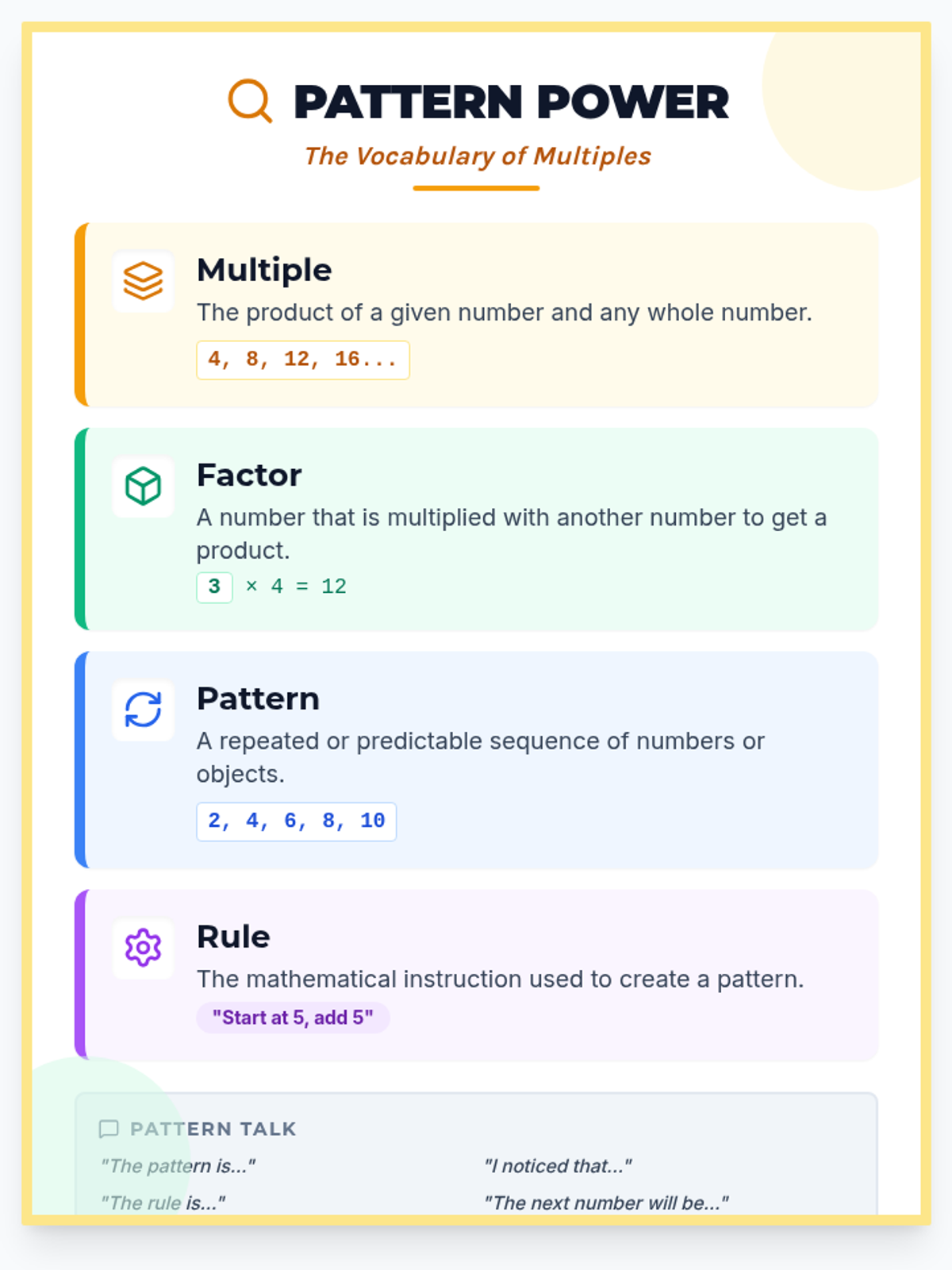 A vocabulary anchor chart for 4th-grade students defining key terms related to multiples and patterns, including Multiple, Factor, Pattern, and Rule, with clear visual examples and icons.