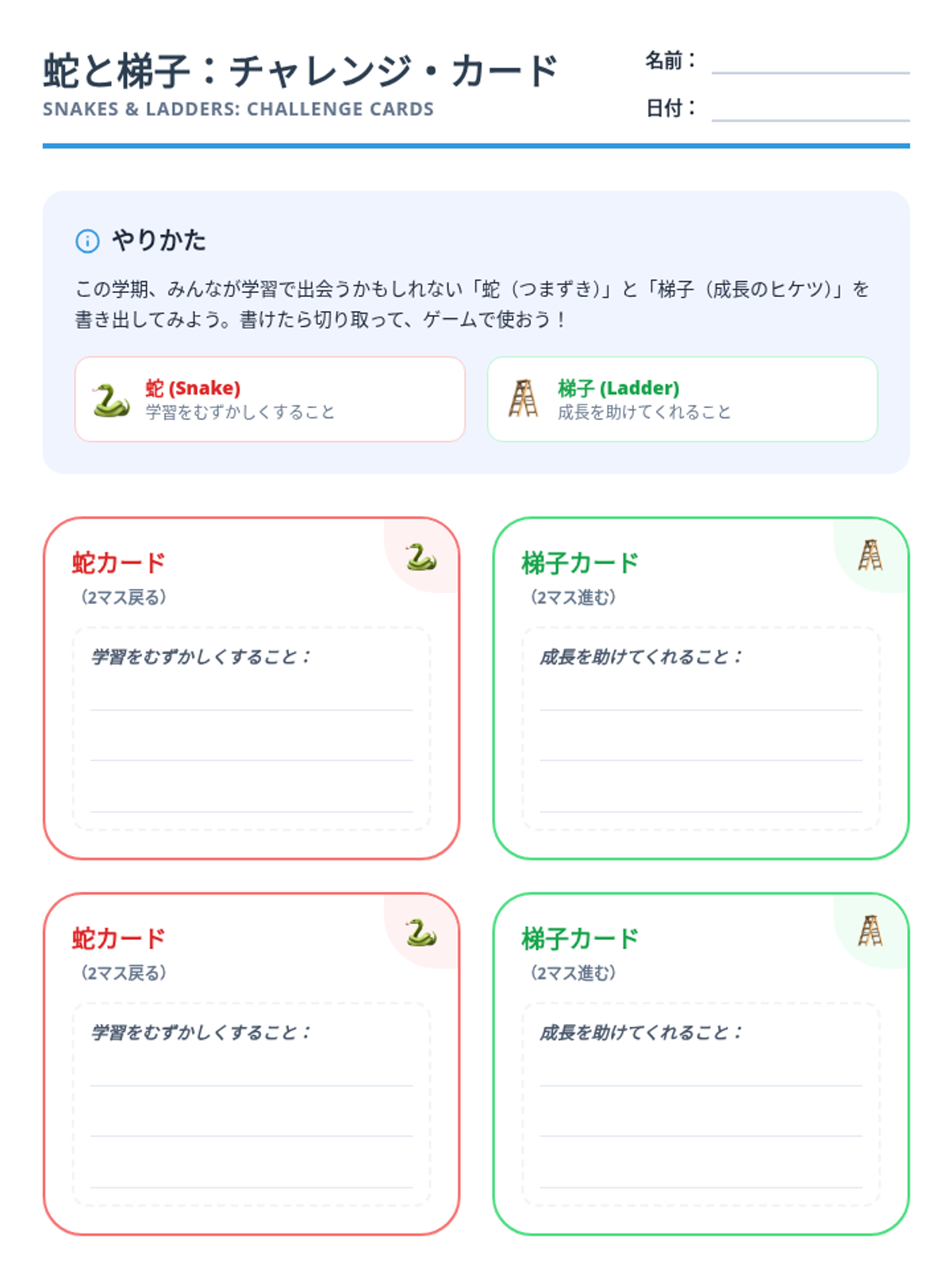 A Japanese worksheet for students to create their own 'Snake' (setback) and 'Ladder' (growth) cards for the SEL classroom activity. Revised for better layout and readability.