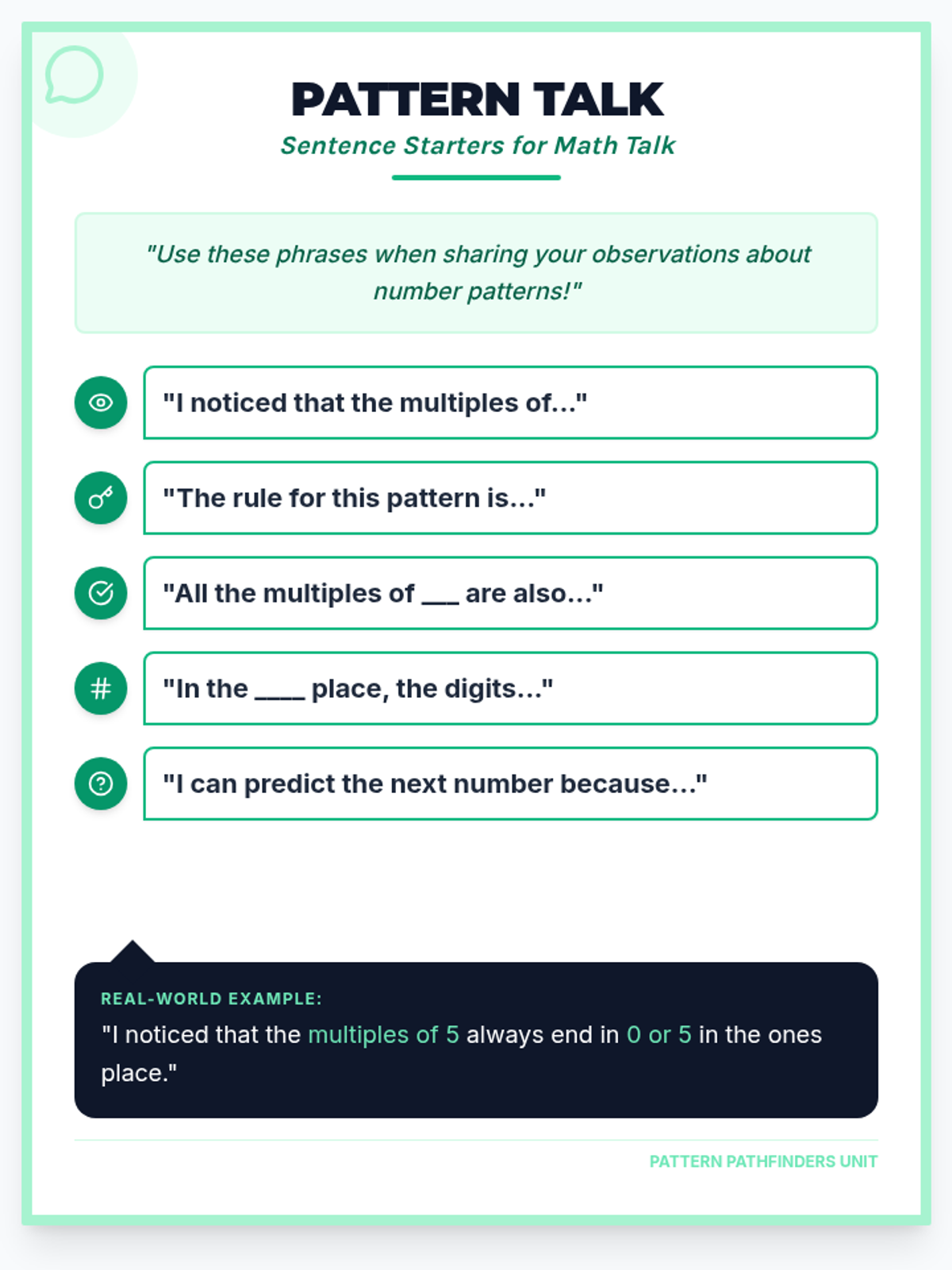 An anchor chart featuring sentence starters to help students articulate their observations about number patterns and multiples, designed with speech bubble motifs and clear icons.