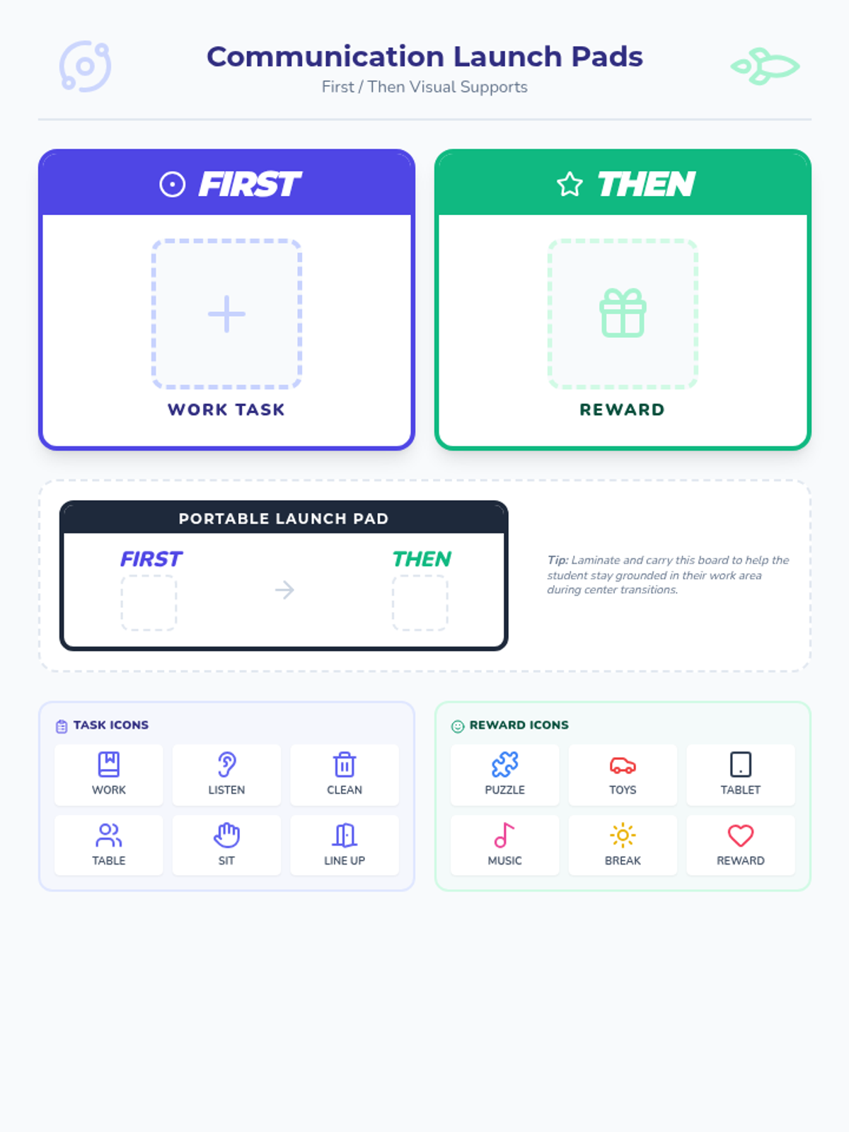 A First/Then visual support board with a Space Explorer theme, featuring both a large desk version and a portable version along with reward choice icons.