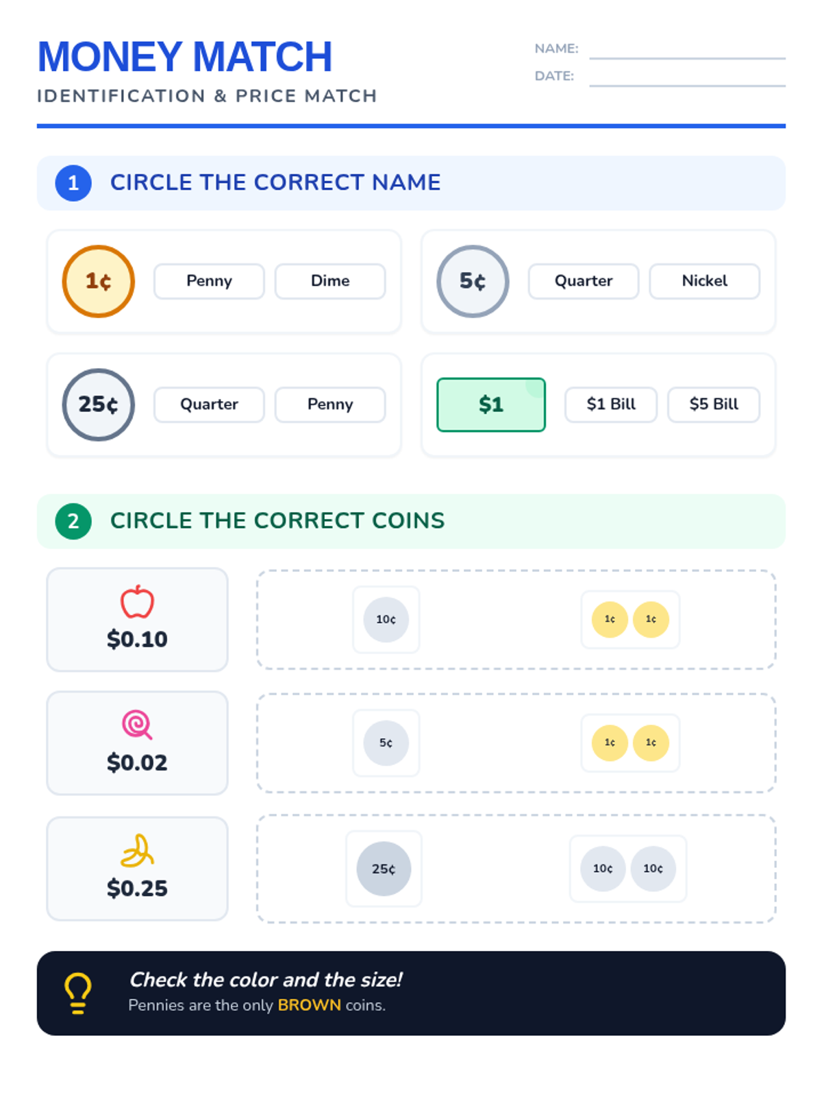 Modified worksheet for identifying US coins and bills, and matching simple item prices to their corresponding coin values. Includes high-contrast visuals and multiple-choice names.