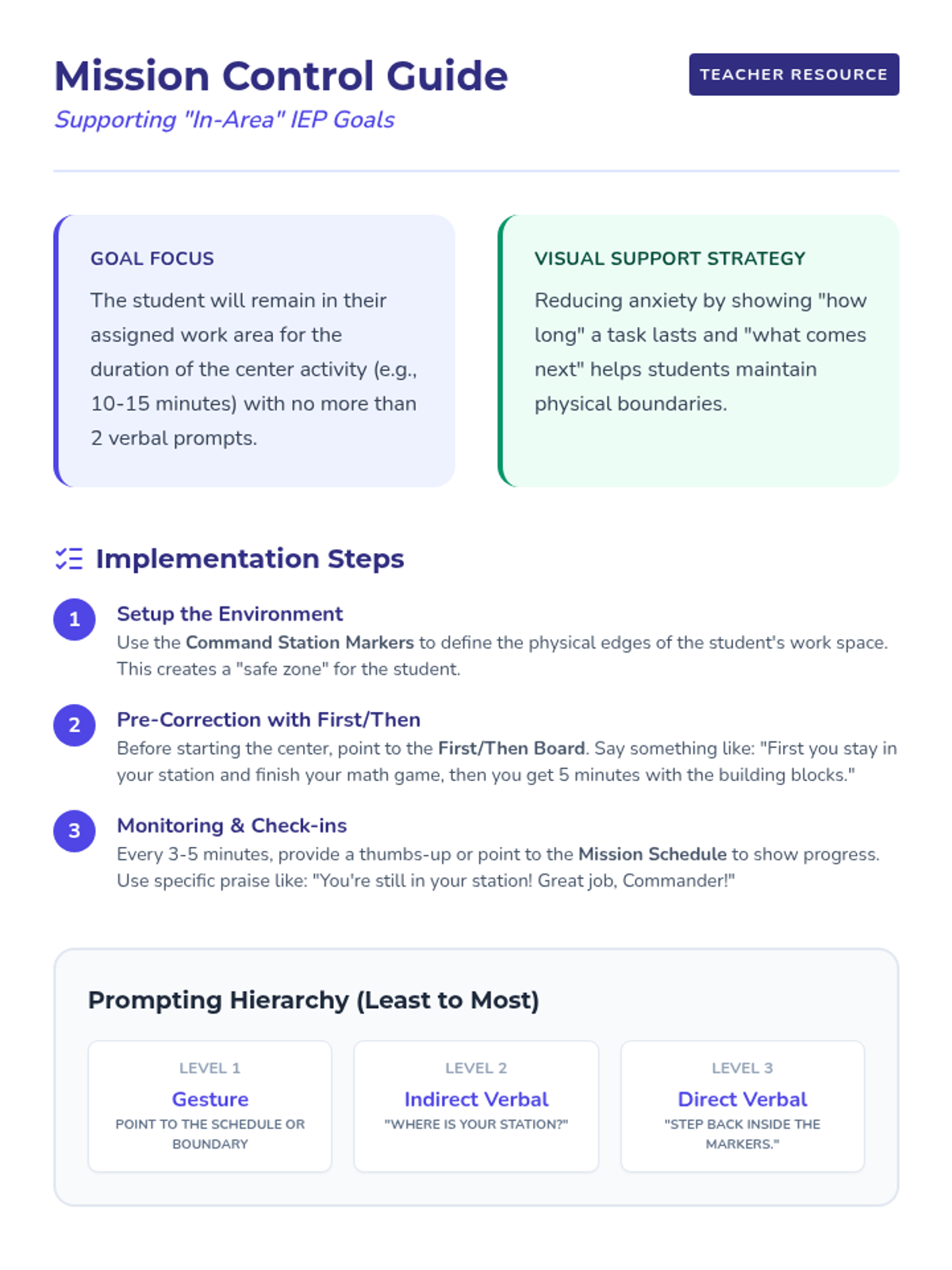 A teacher-facing guide providing specific strategies, prompting hierarchies, and implementation steps for using visual supports to help students meet IEP goals related to staying in their work area.