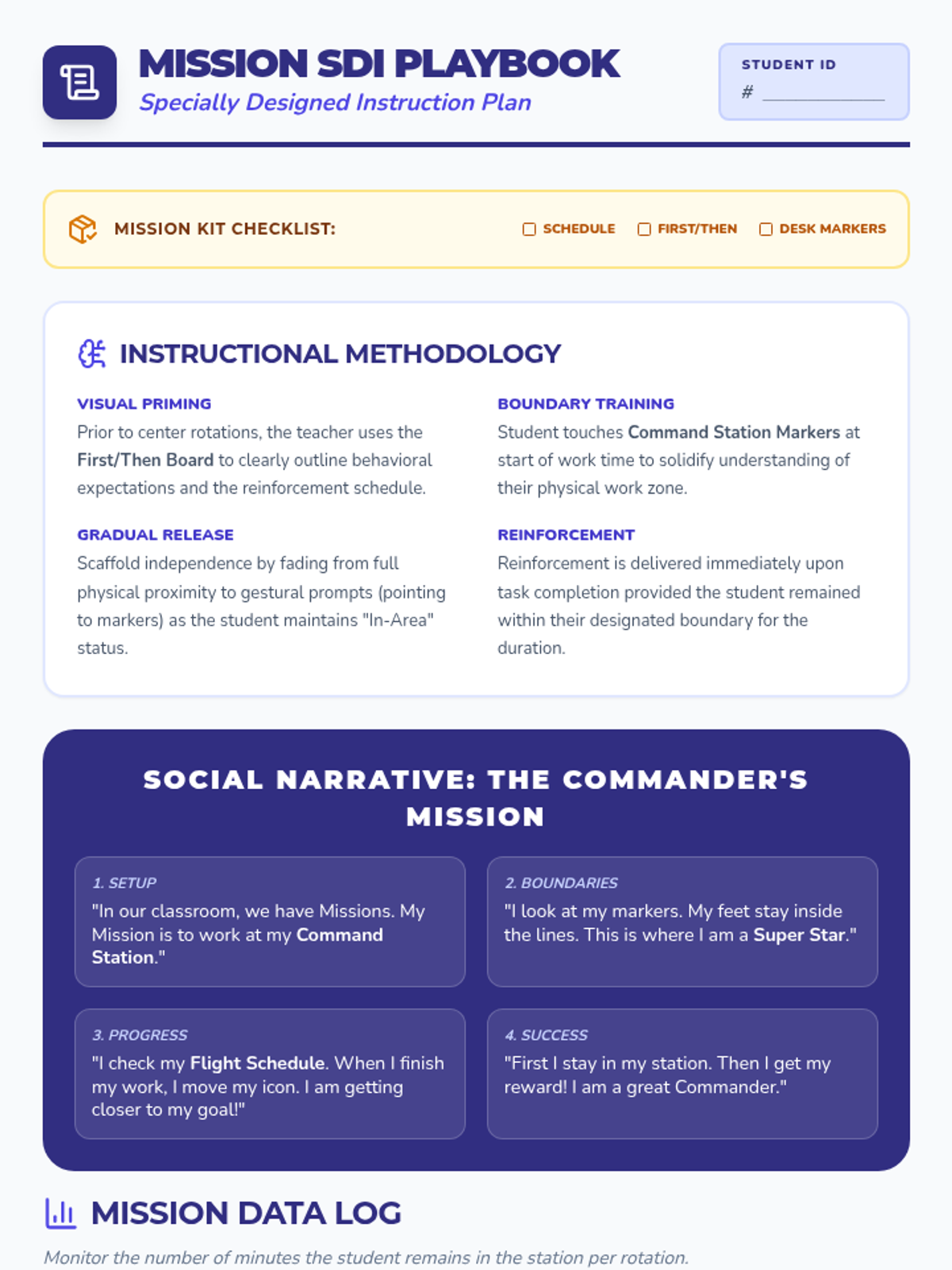 A specialized playbook for delivering instruction on IEP goals, including methodology (SDI), a student-facing social narrative, and a progress monitoring data log.