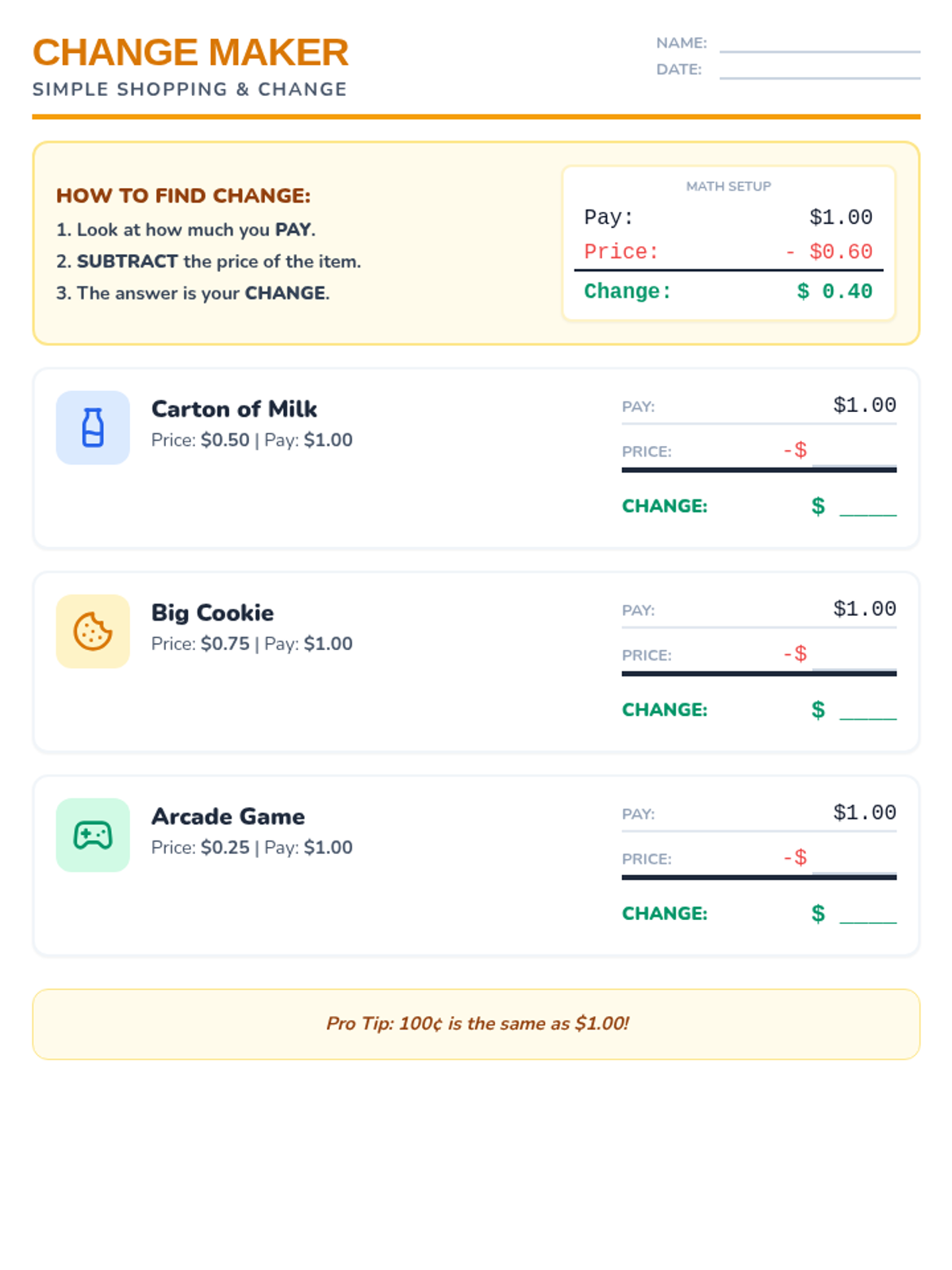 A guided worksheet for calculating simple change from $1.00. Features a structured vertical subtraction layout for each problem and visual prompts to guide the process.