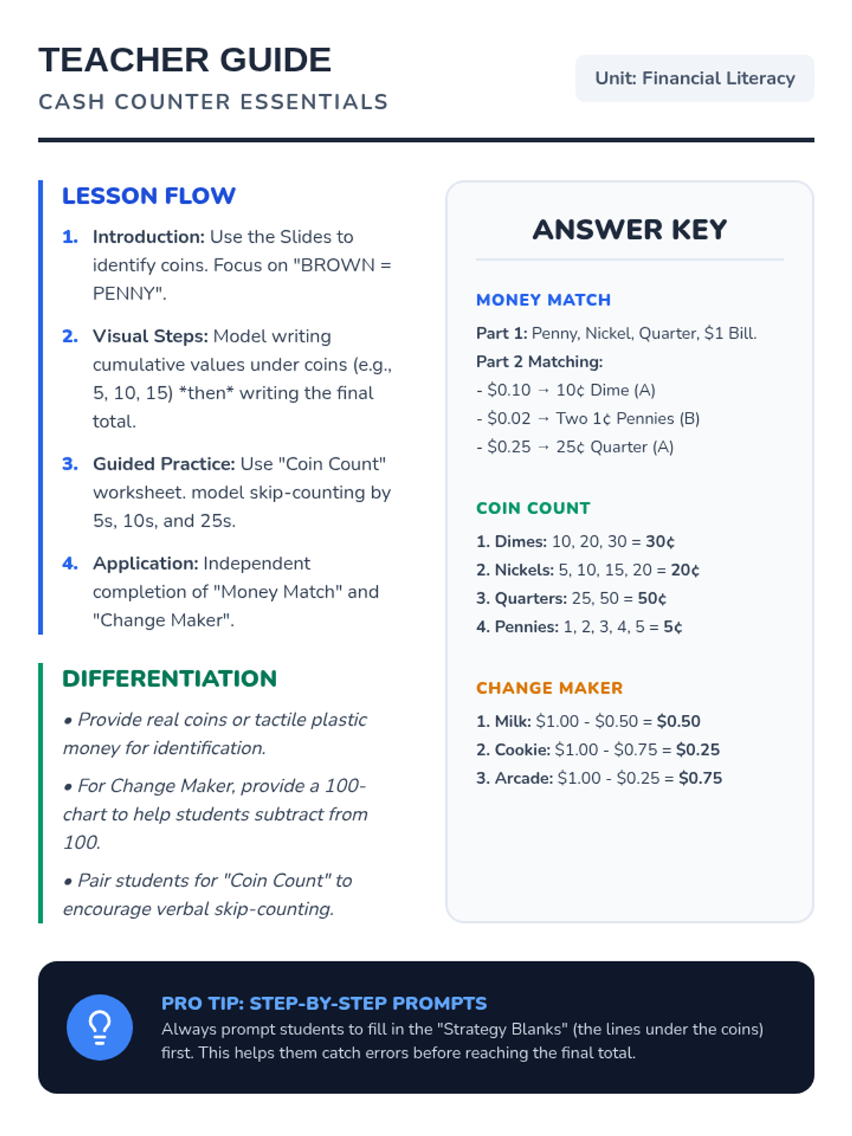 Teacher's facilitation guide and answer key for the Cash Counter Essentials lesson. Includes instructional pacing, differentiation strategies, and completed answer keys for all student worksheets.