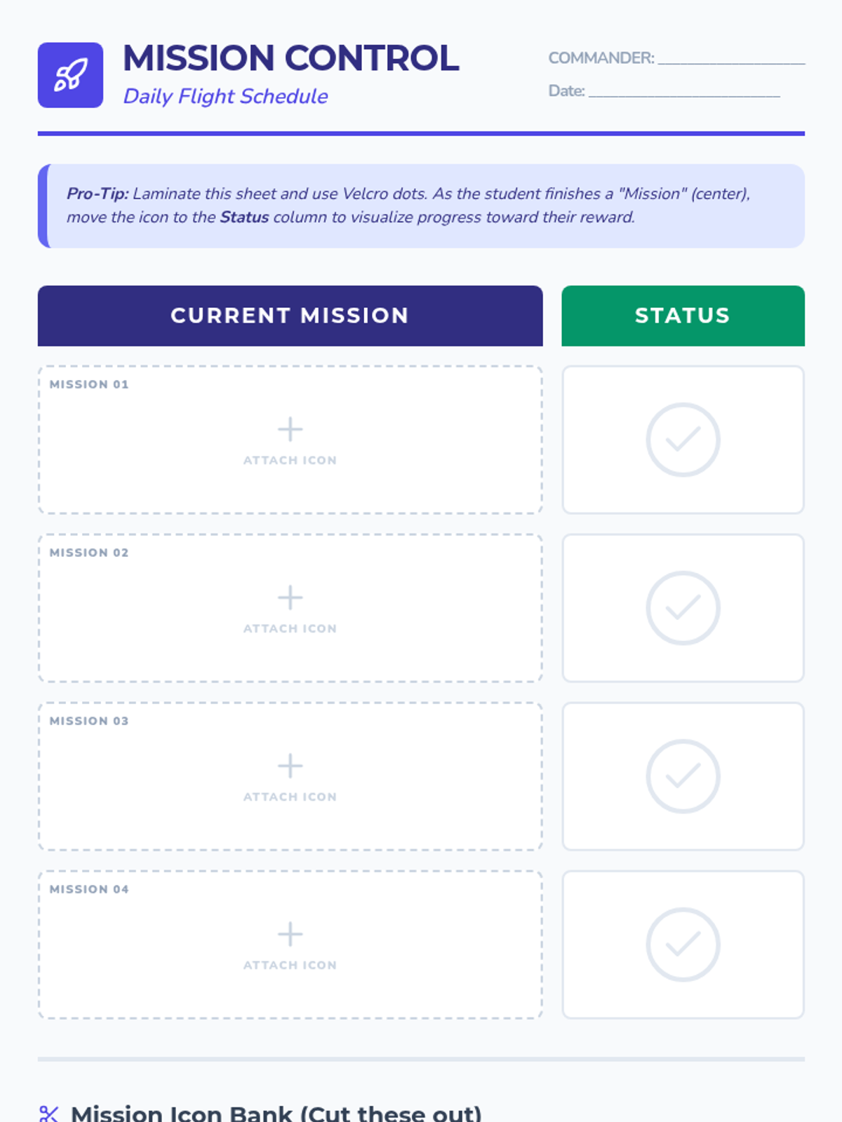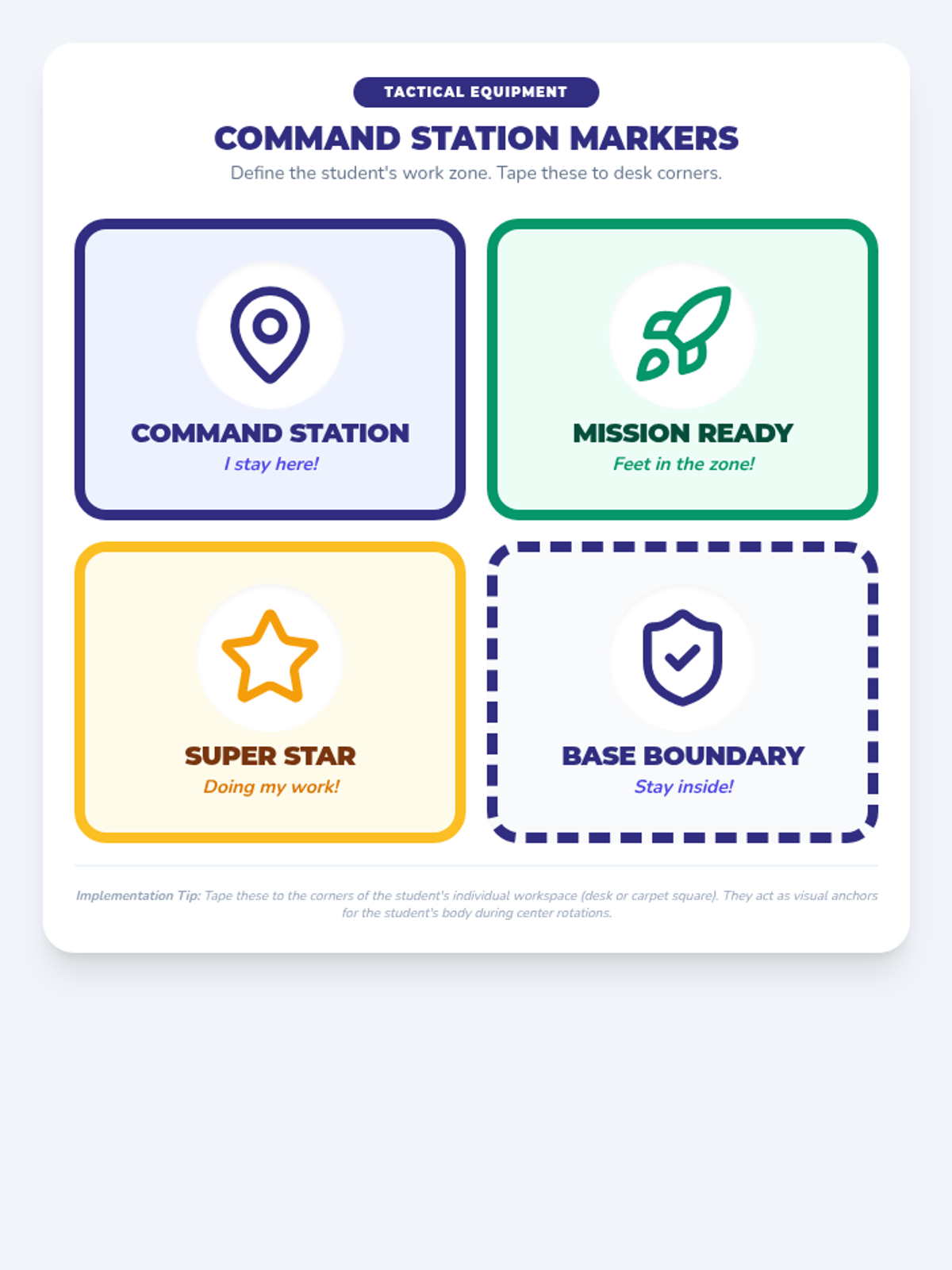 A set of cut-out visual markers to define the boundaries of a student's work area, using a 'Mission Control' theme to encourage them to stay in place.