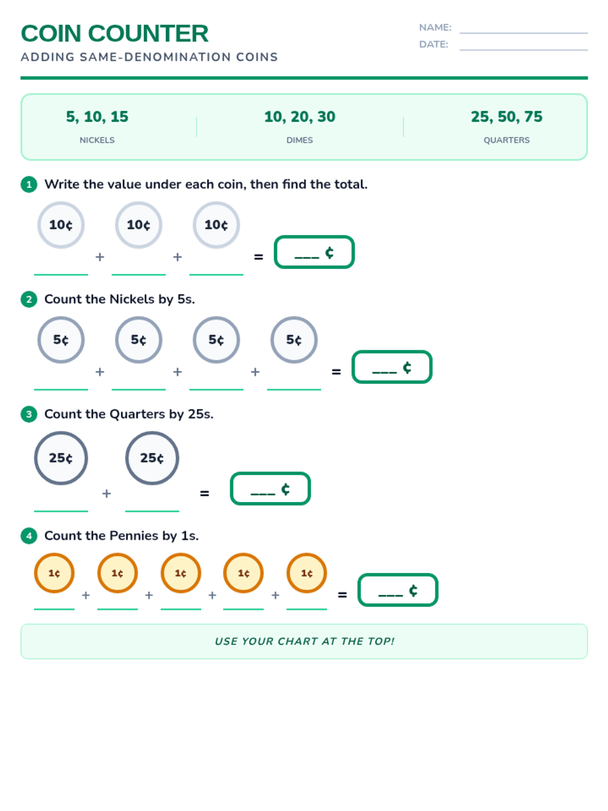Practice worksheet for adding same-denomination coins using a skip-counting strategy. Includes guided blanks for students to write cumulative totals under each coin.