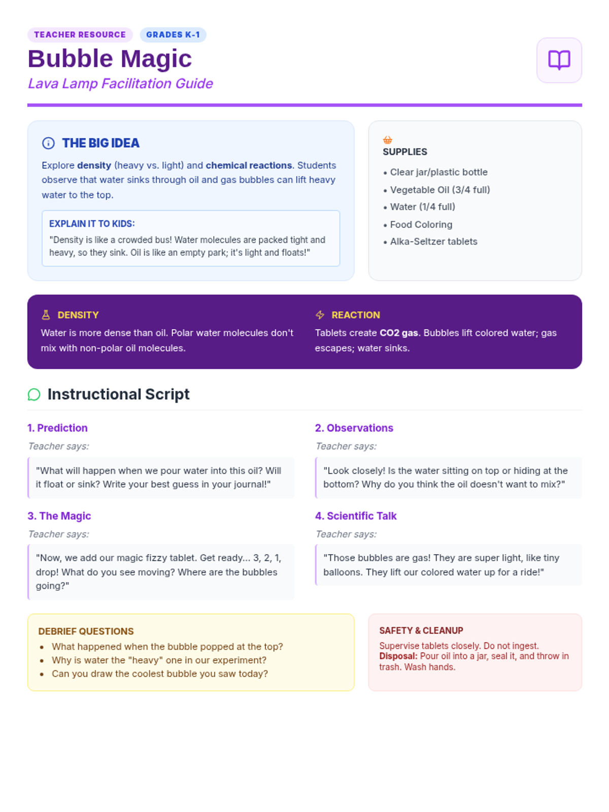 A teacher's facilitation guide for the Bubble Magic lava lamp experiment. It provides scientific background on density and chemical reactions, prep instructions, safety tips, and a step-by-step instructional script for the classroom.