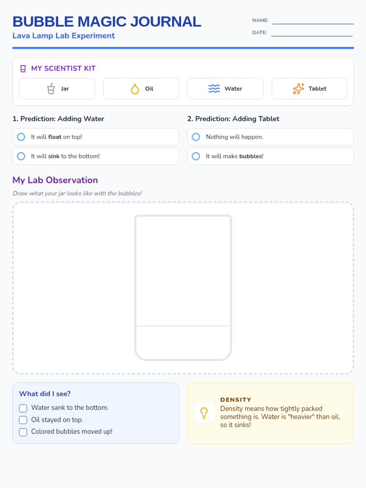 A student-facing observation worksheet for the lava lamp experiment. It includes sections for predictions, a space for drawing lab results, and checkboxes for making simple scientific observations.
