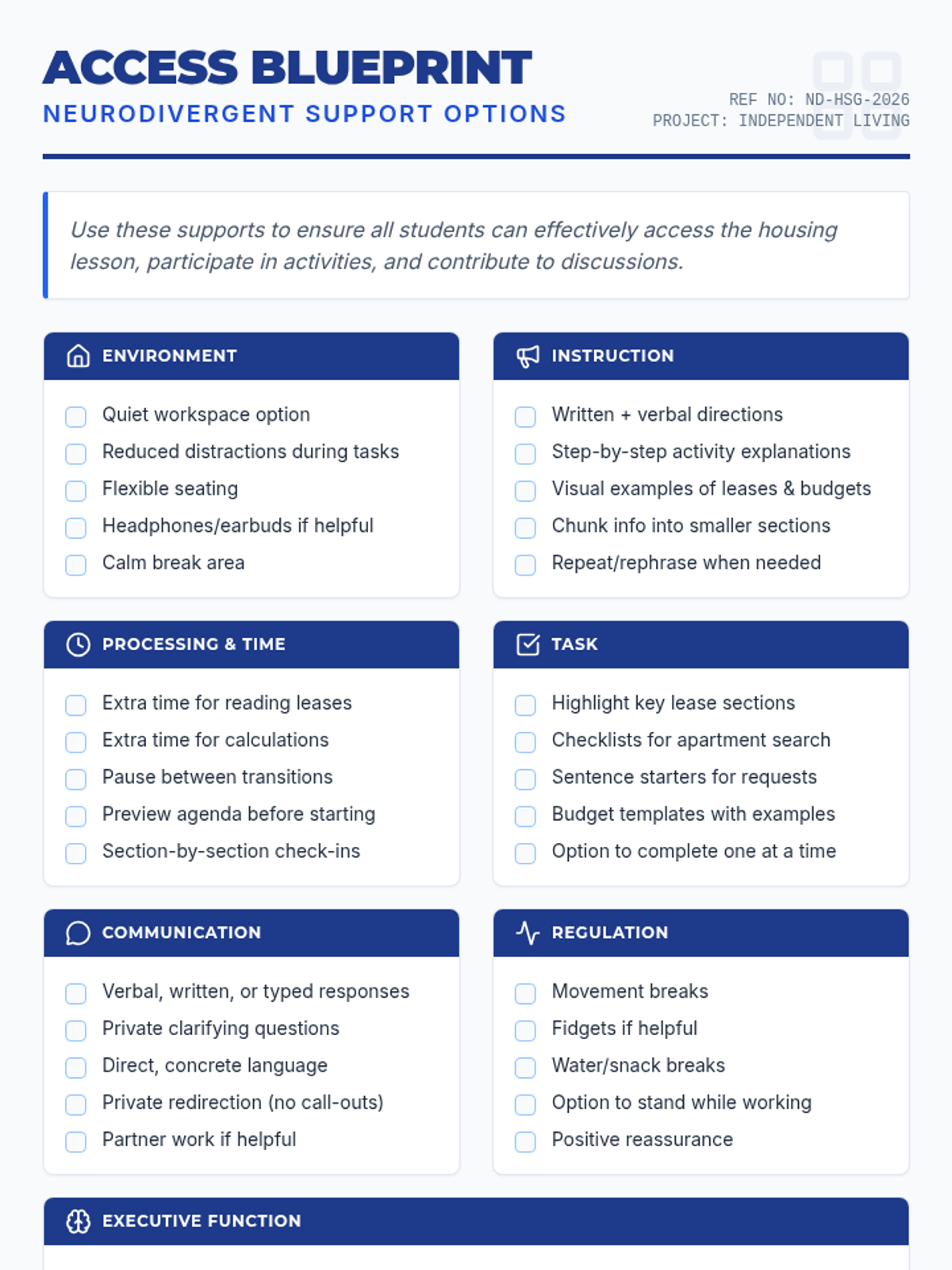 A comprehensive teacher resource guide outlining various neurodivergent support options categorized by environment, instruction, processing, and more, specifically tailored for a housing or independent living lesson.