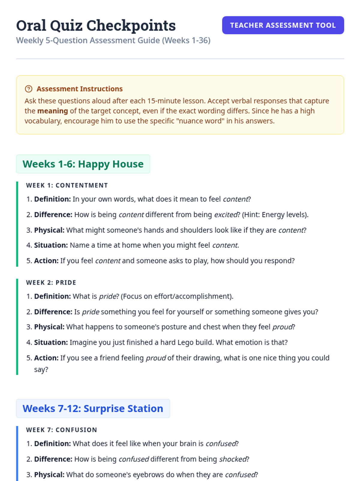 A comprehensive guide for teachers to conduct oral assessments after each weekly lesson, featuring specific questions for every phase of the 36-week program.
