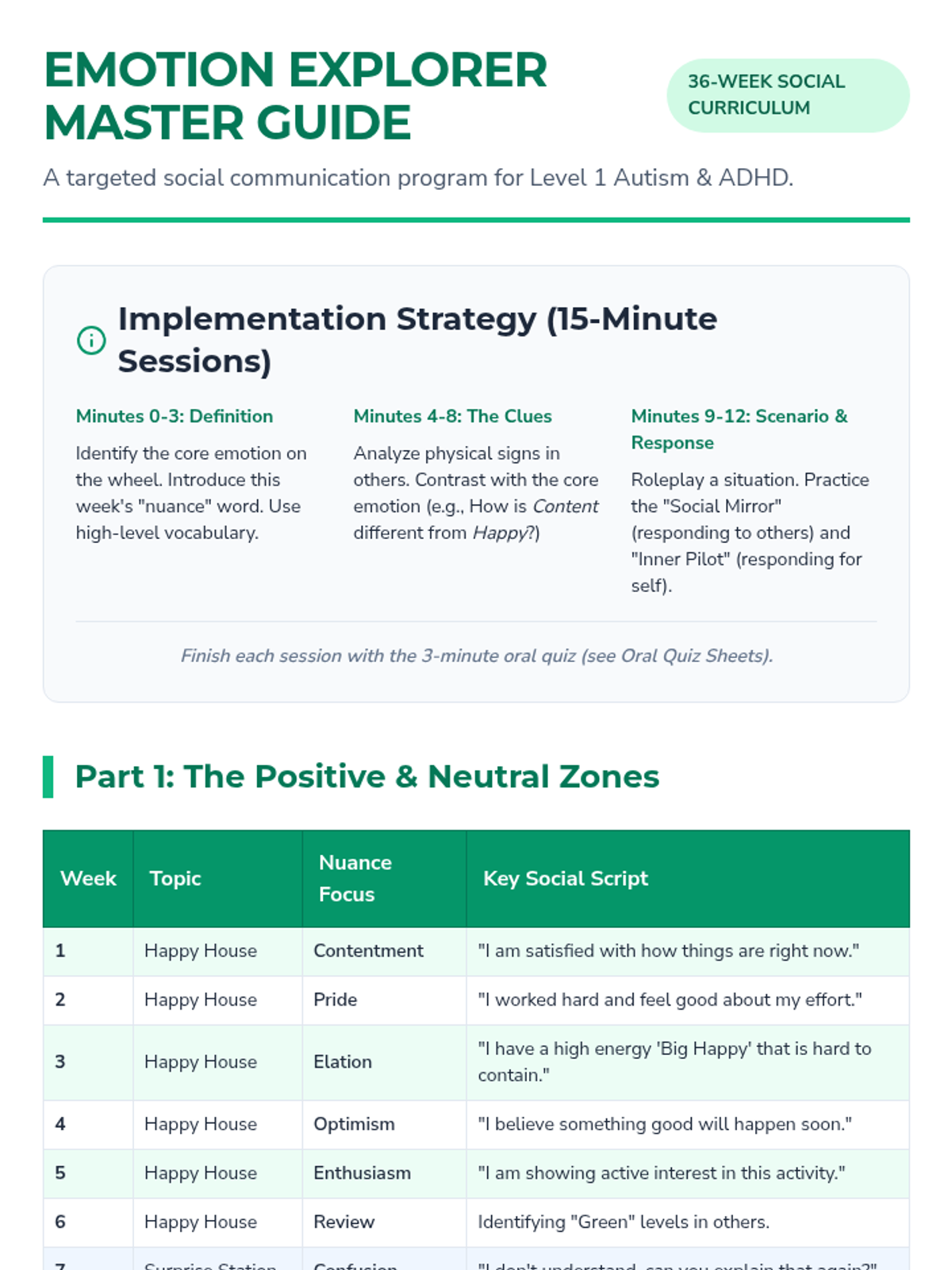 A comprehensive 36-week curriculum guide for teachers, mapping out weekly emotion nuances, social scripts, and implementation strategies for children with Level 1 autism and ADHD.