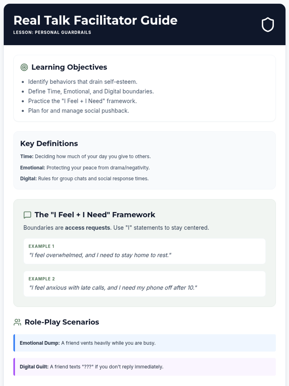 A teacher guide for facilitating discussions on boundaries and self-esteem for young adults, including learning objectives, role-play scenarios, and facilitation tips.