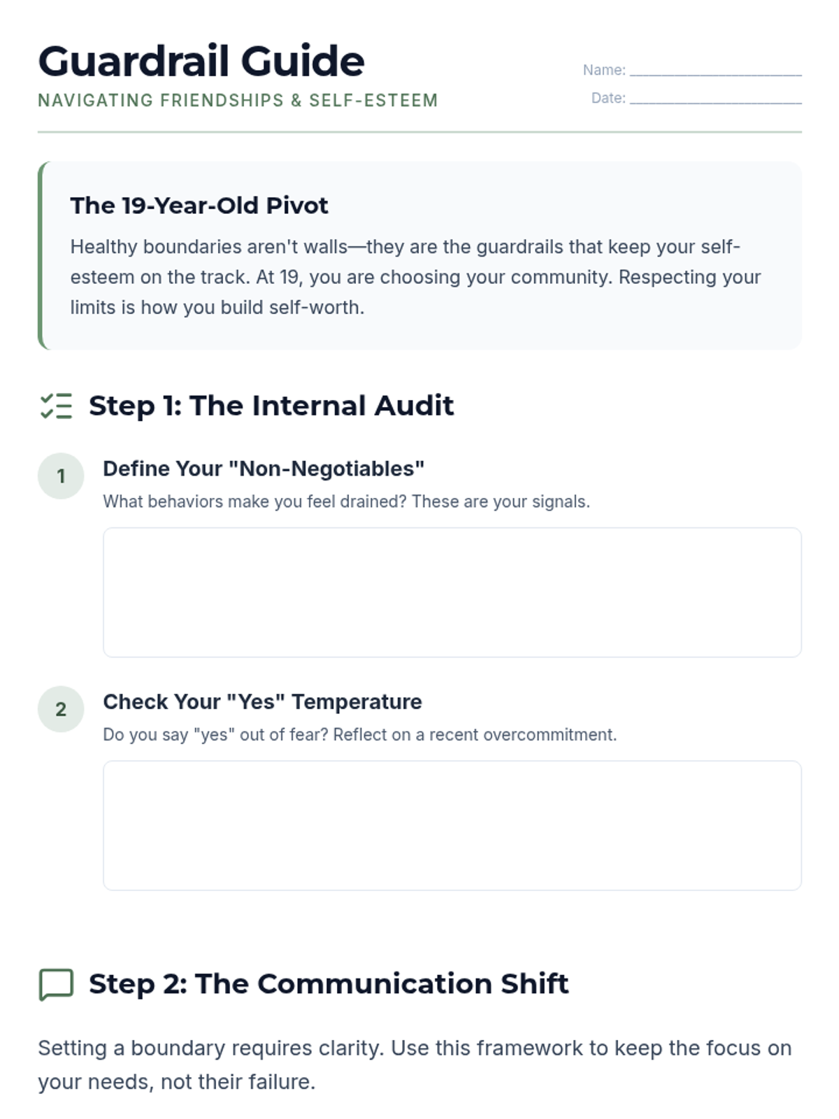 A two-page guide and worksheet for young adults focused on identifying personal limits, communicating boundaries using 'I' statements, and maintaining self-esteem within friendships.