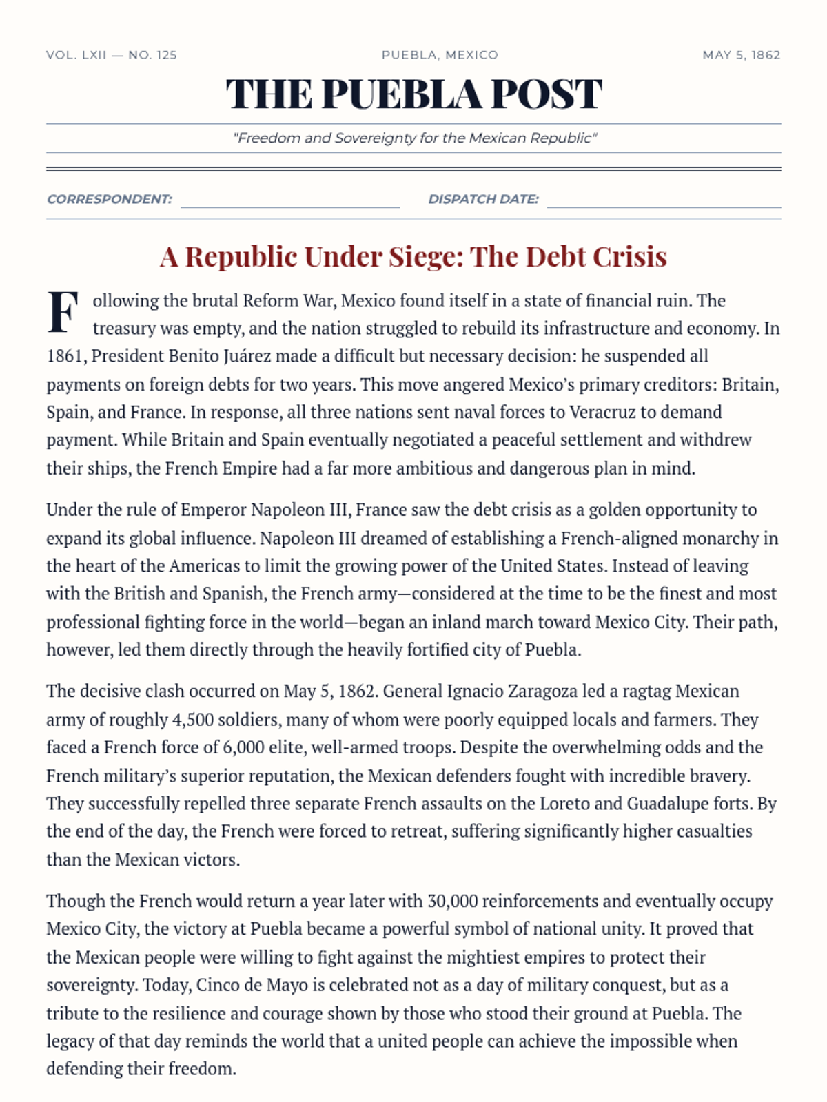 A reading comprehension worksheet styled as a 19th-century newspaper, telling the story of the debt crisis and the Battle of Puebla with seven analysis questions.