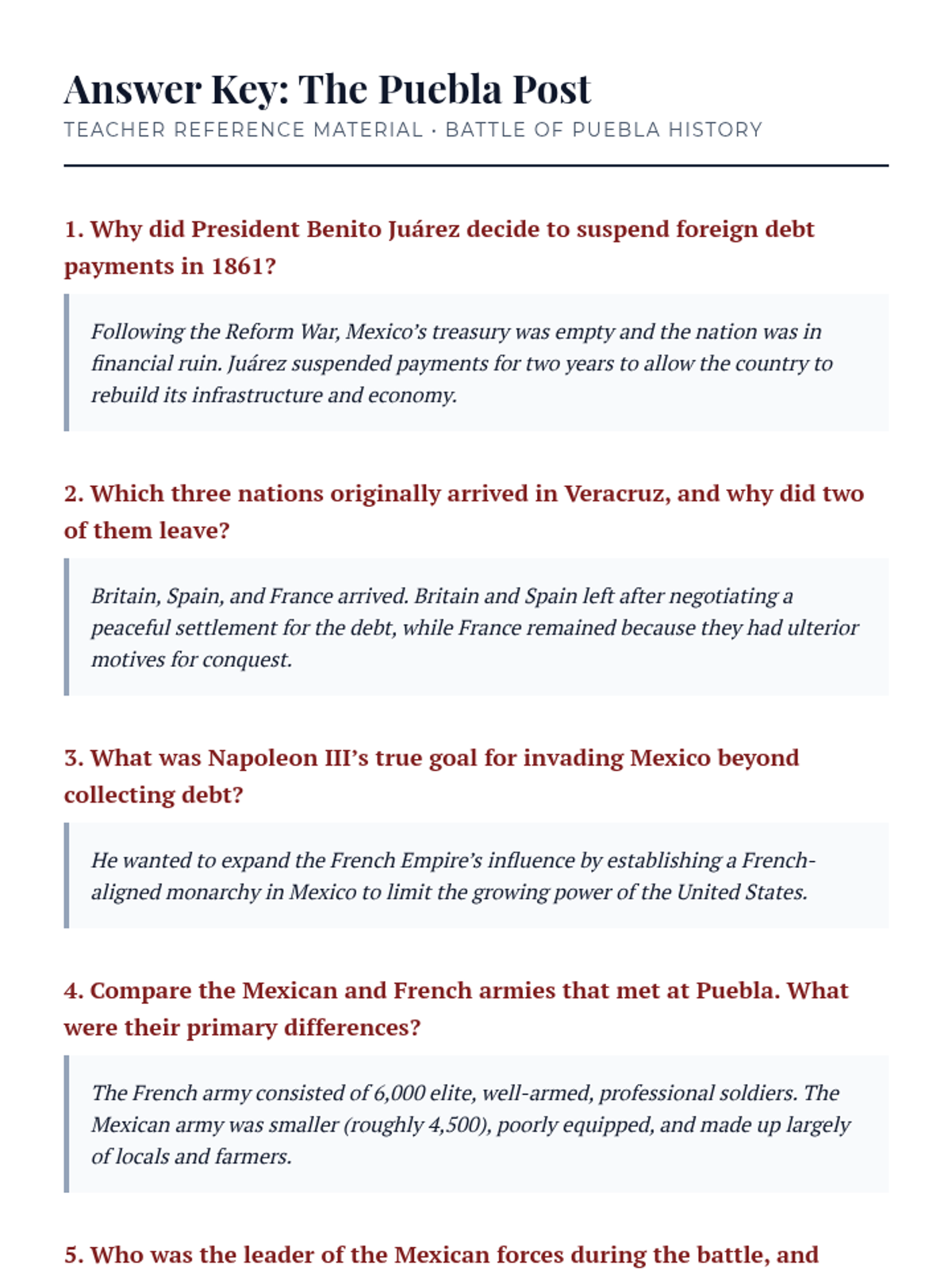 A teacher answer key for the Puebla Post reading comprehension worksheet, including suggested answers and instructional tips.