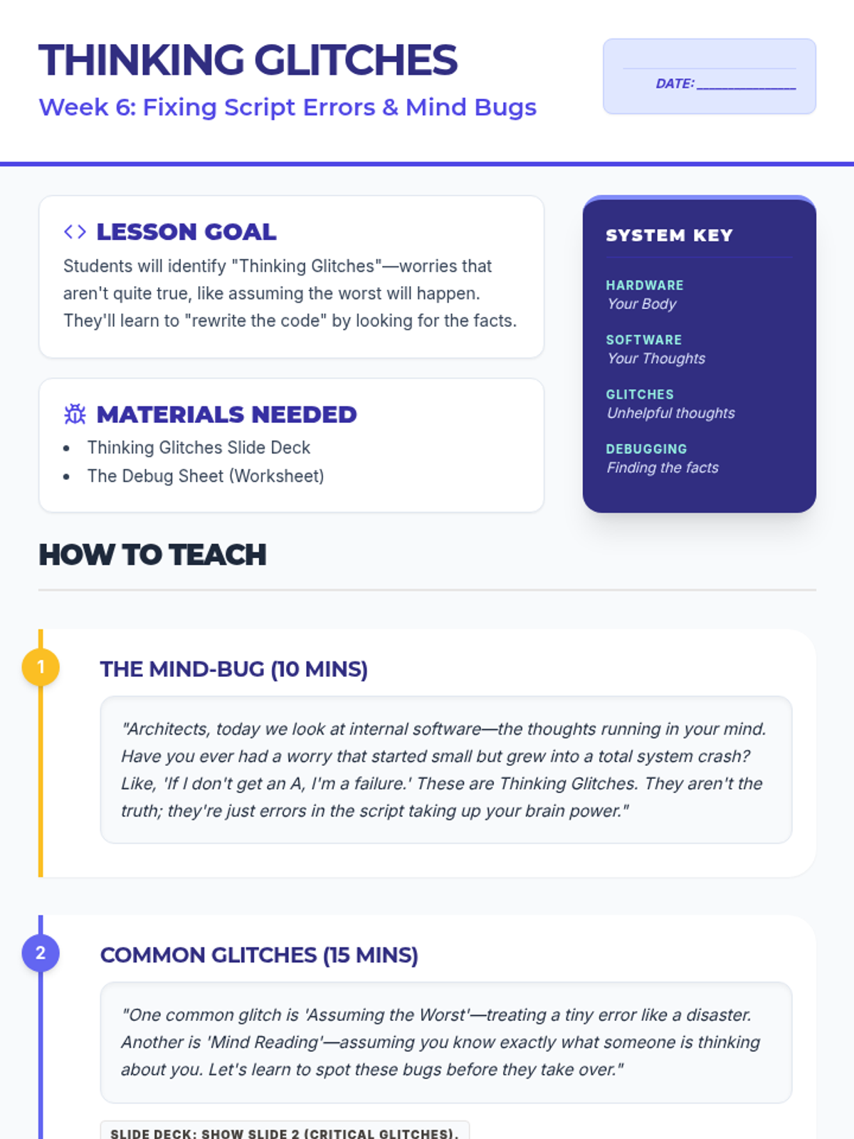 A comprehensive teacher guide for a 20-minute lesson on building social connections. Includes timing, prep instructions, and a step-by-step instructional roadmap.