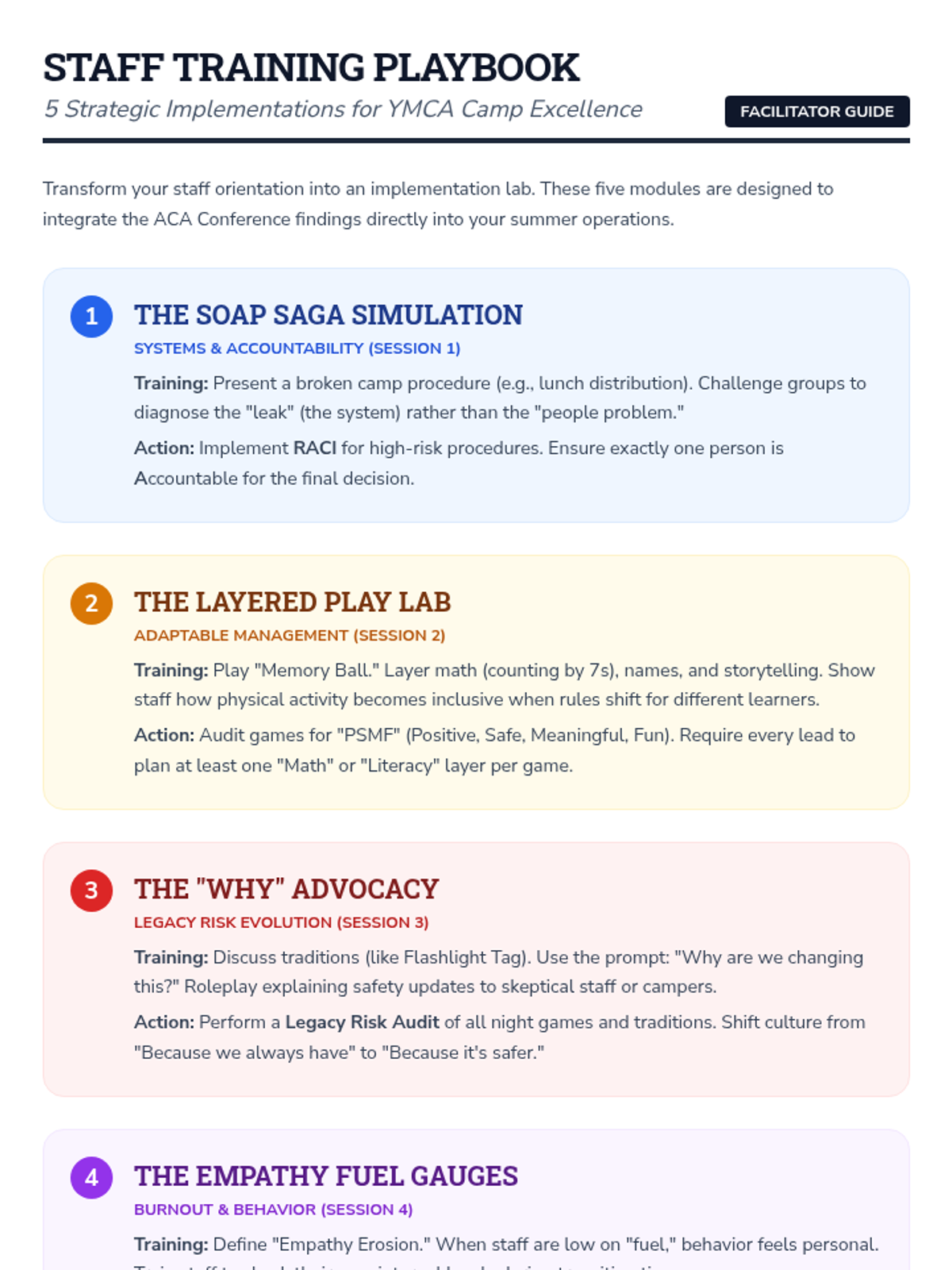 A training facilitator's guide outlining 5 specific, actionable modules to implement at staff training based on the ACA conference notes.