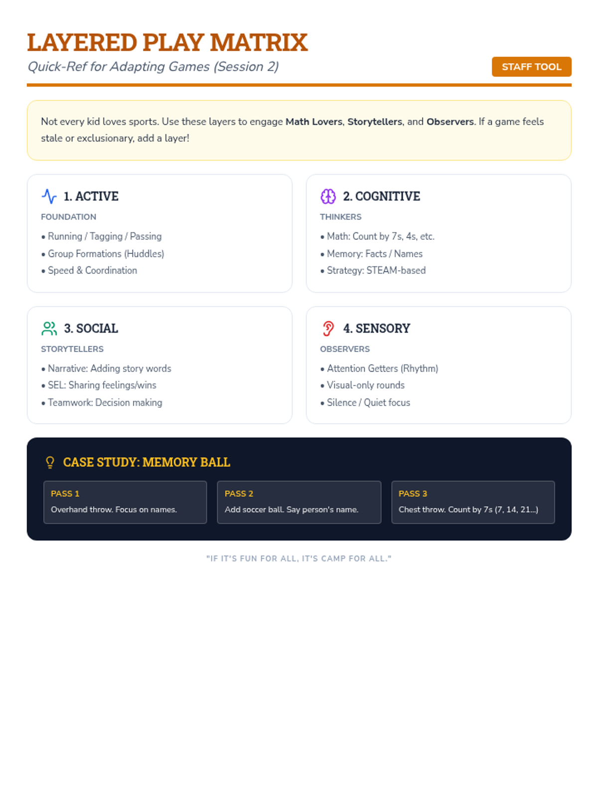A quick-reference guide for camp staff to help them adapt any game by adding layers of math, literacy, or social-emotional learning.