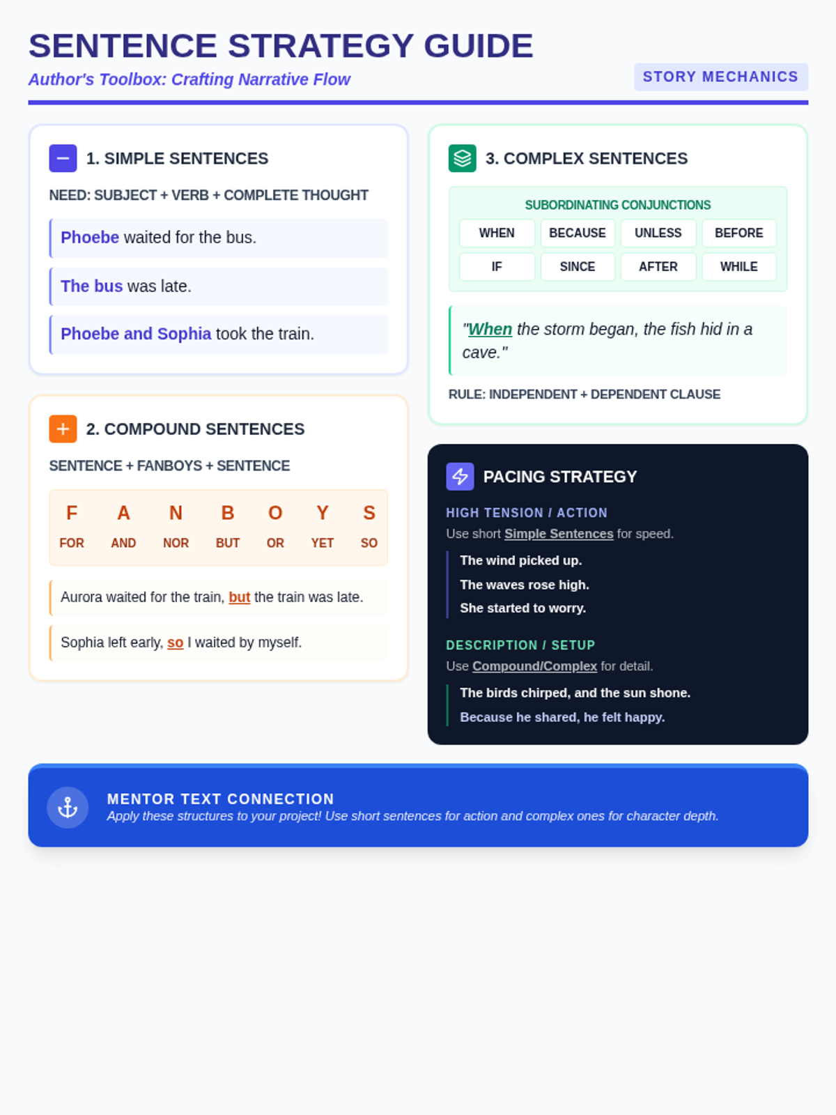 A comprehensive reference guide for students covering simple, compound, and complex sentence structures, including the FANBOYS conjunctions and strategies for using sentence types in narrative writing. Revised for better layout and legibility.