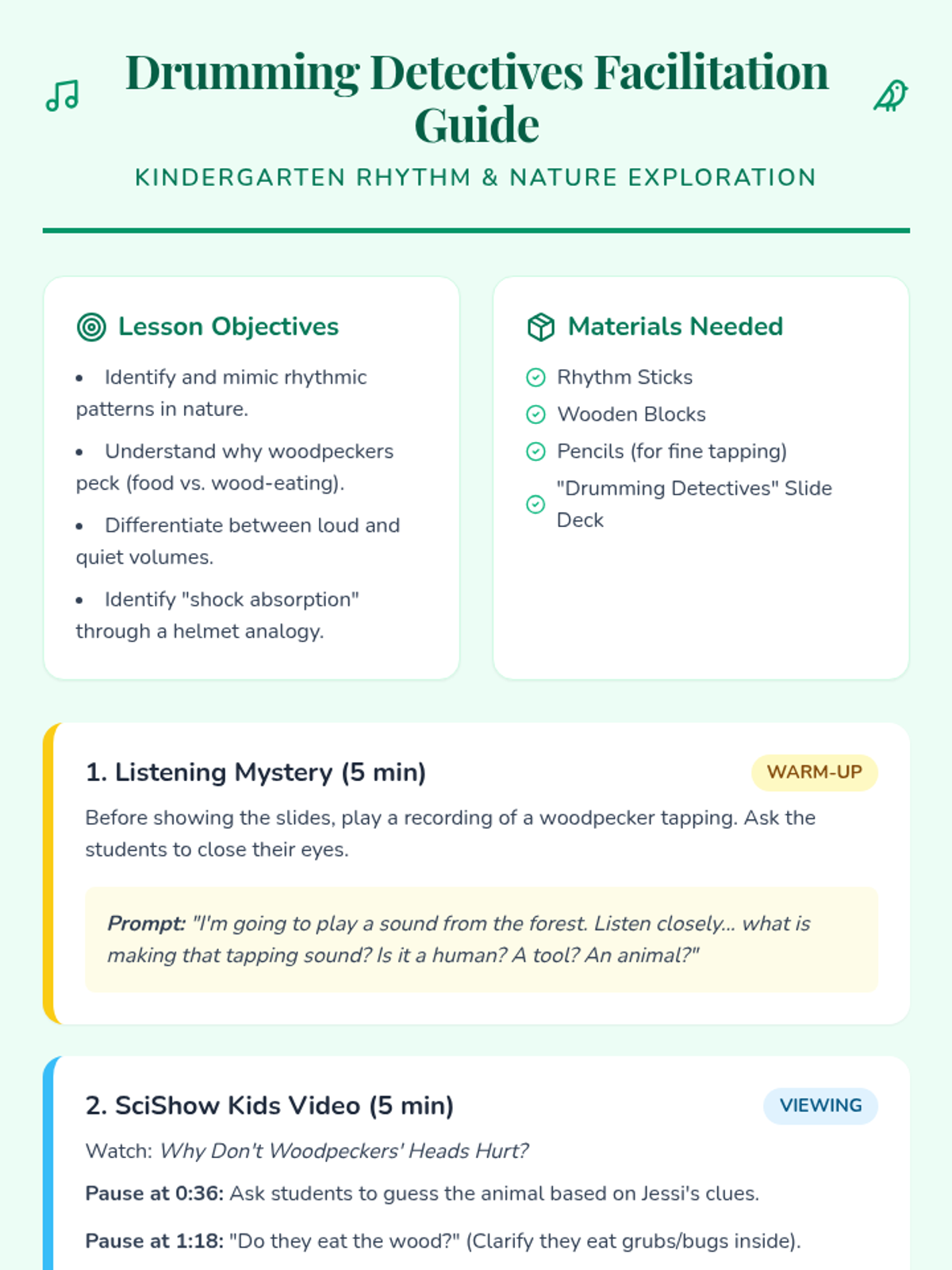 A comprehensive teacher facilitation guide for a kindergarten lesson on woodpeckers, including rhythmic patterns, video discussion prompts, and game instructions.