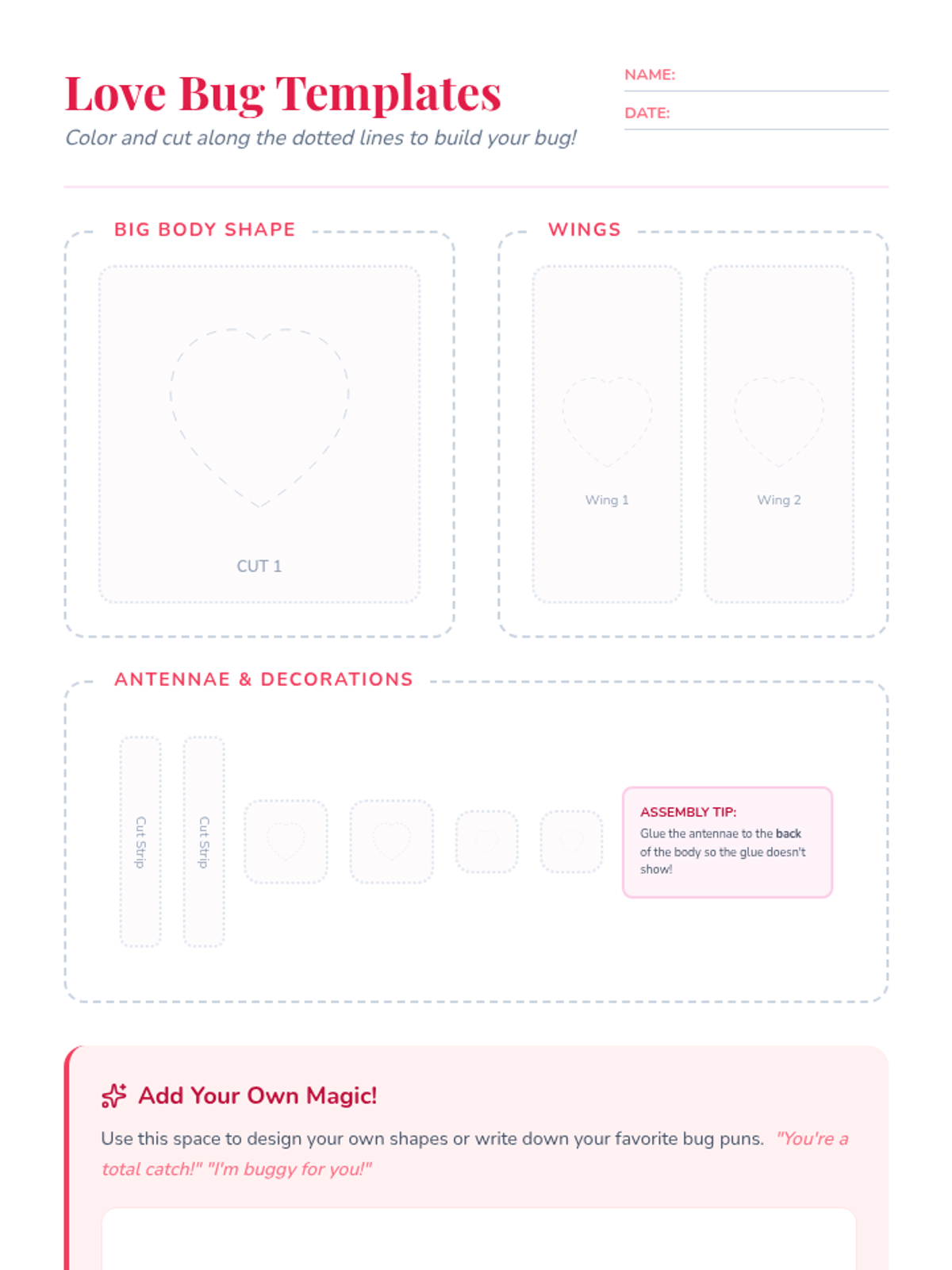 A printable template sheet for young students with dotted-line shapes (hearts, circles, and strips) to color, cut, and assemble into 'Love Bugs'.