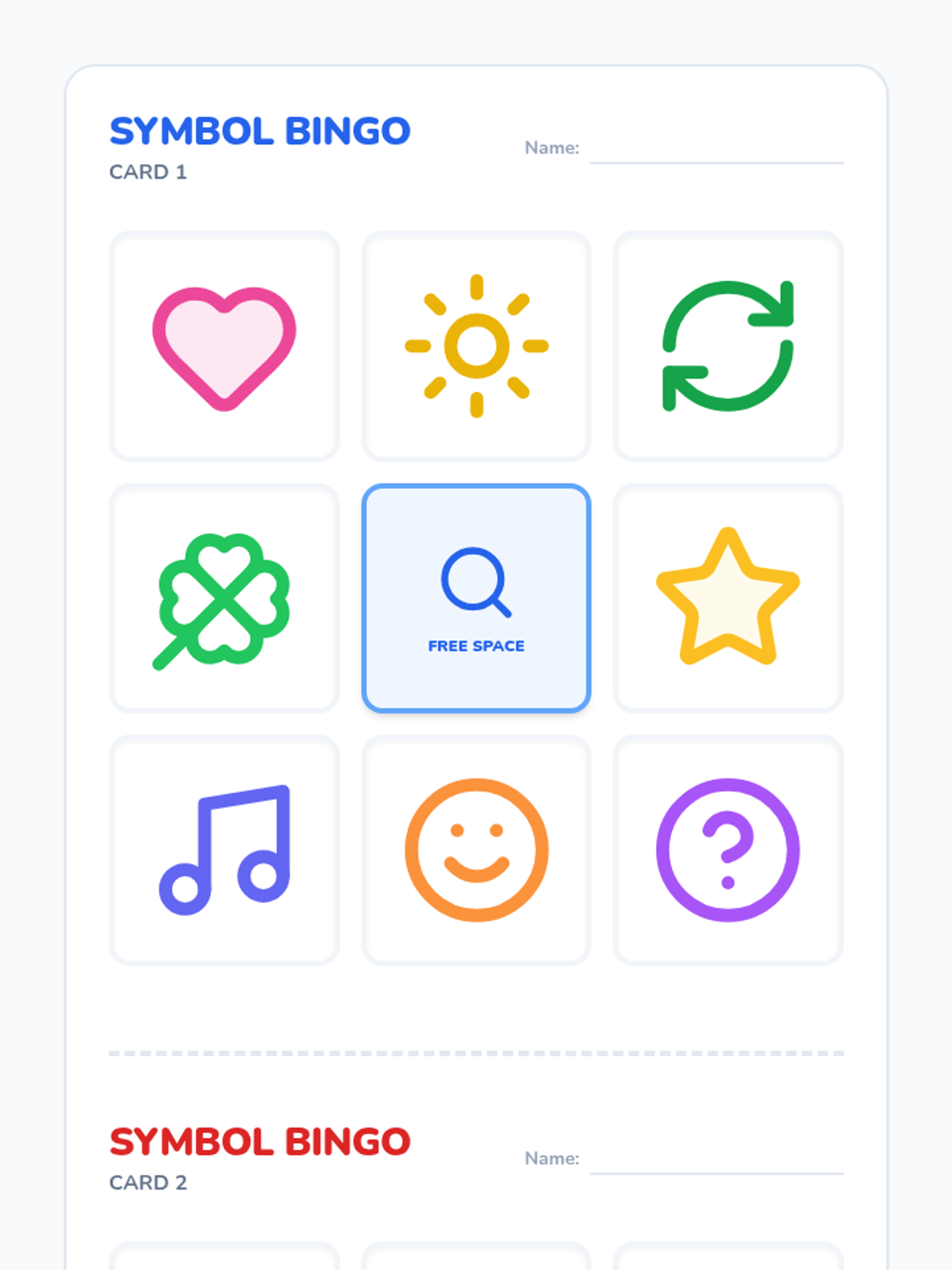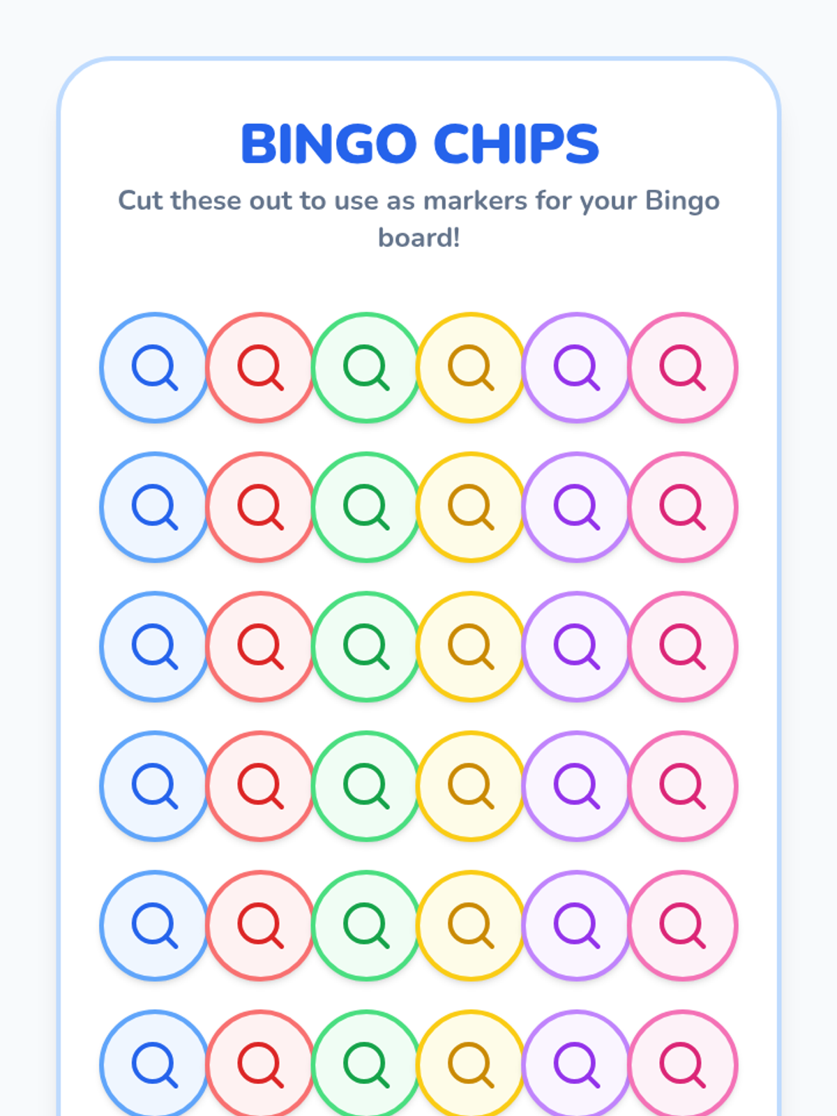 A sheet of colorful circular markers featuring a "Symbol Detective" magnifying glass. Students can cut these out to use during the Symbol Bingo game.