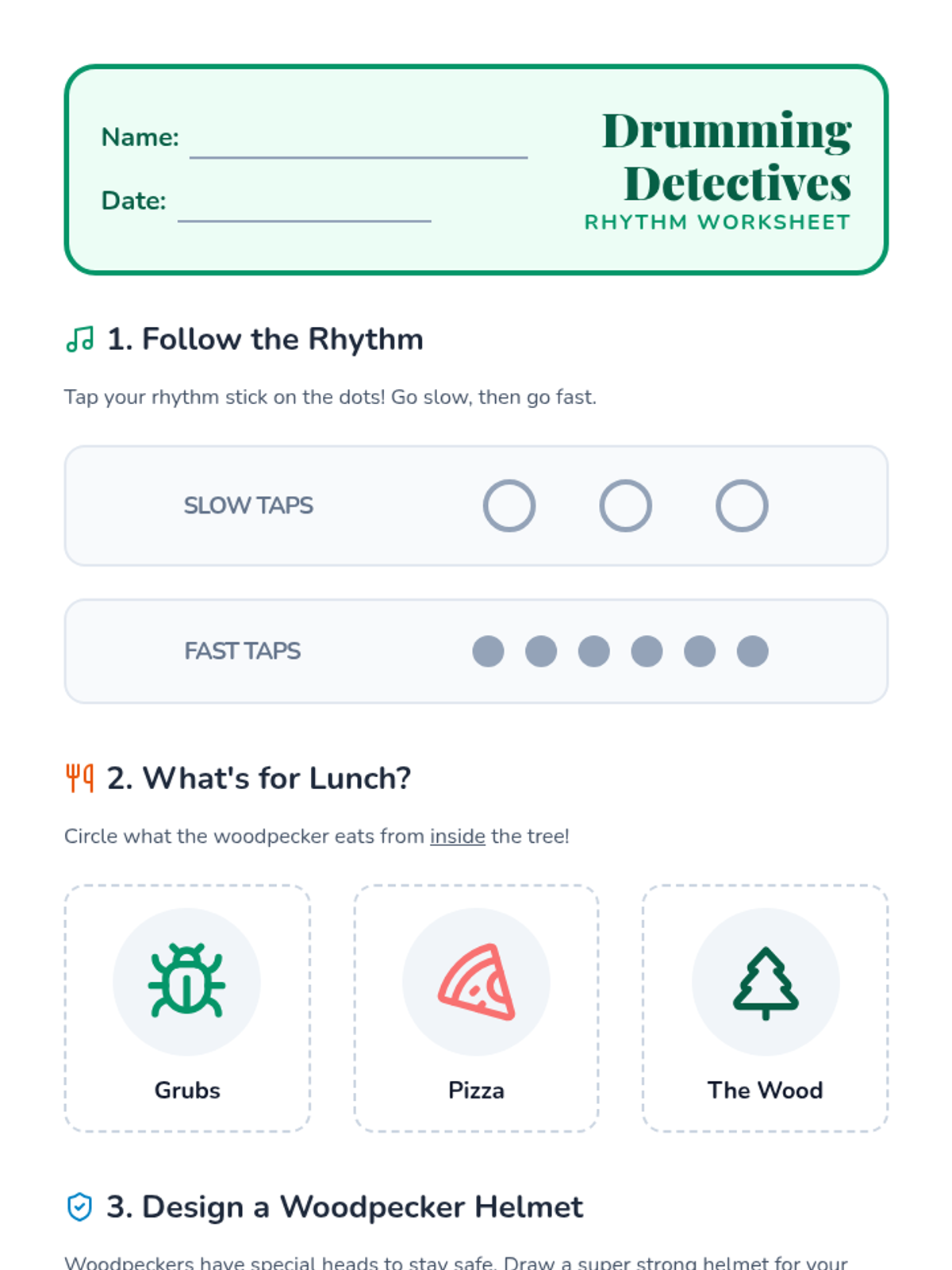 A visual activity sheet for kindergarteners to practice rhythm patterns, identify woodpecker diets, and creatively draw a 'protective helmet' for a bird.