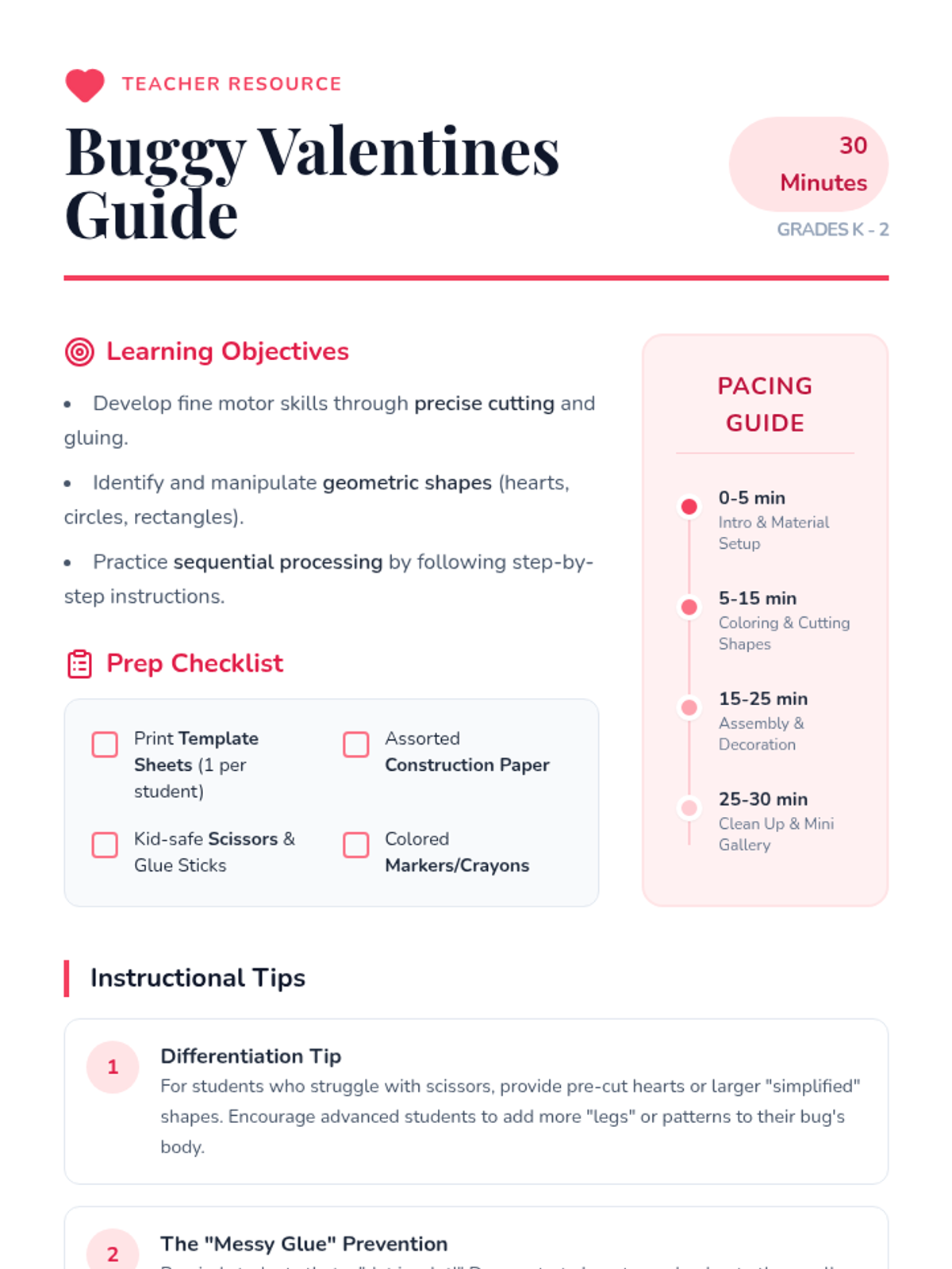A concise teacher guide for the Love Bug craft, including learning objectives, a 30-minute pacing guide, differentiation tips, and discussion prompts.