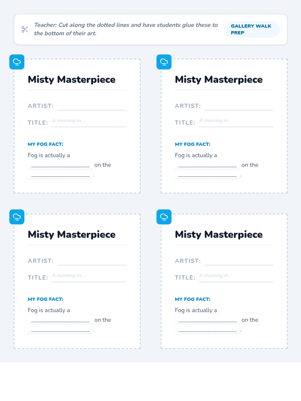 Printable labels for students to attach to their foggy landscape artwork, including space for their name, title, and a "Fog Fact" from the lesson.