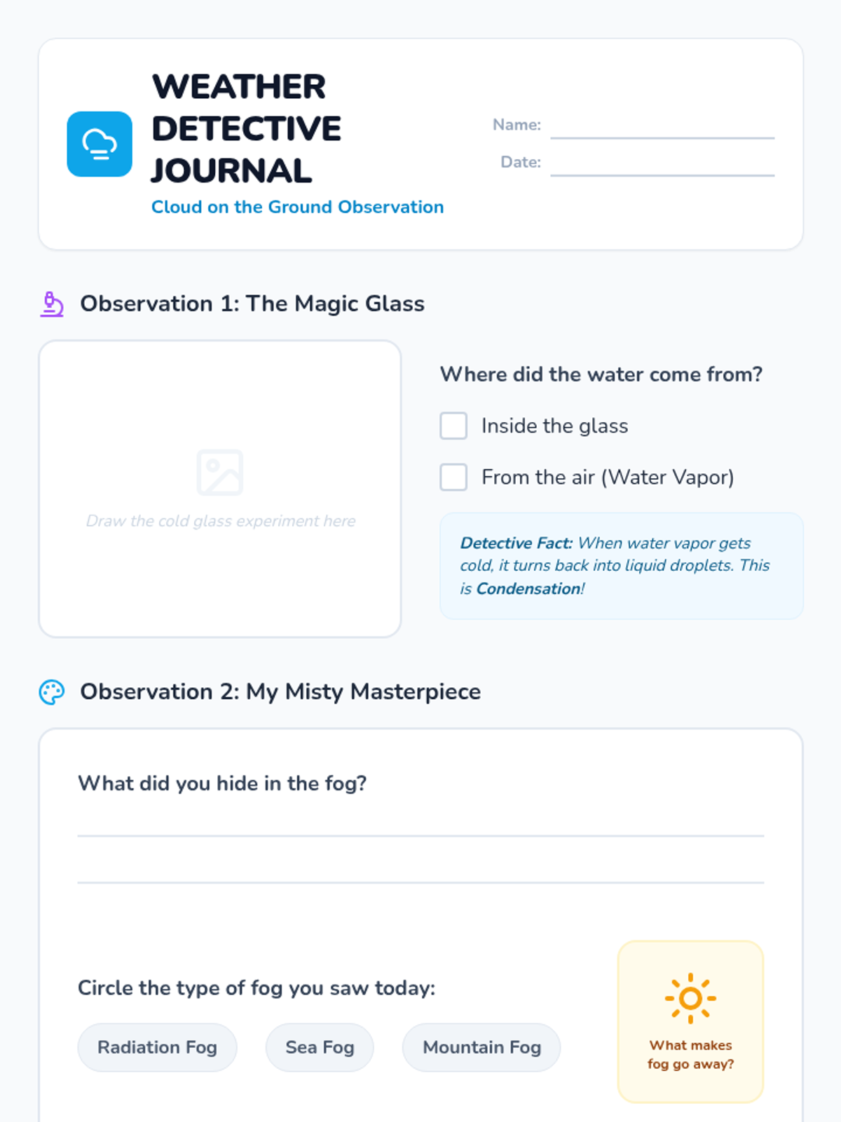 A student-facing "Weather Detective Journal" for recording observations from the SciShow Kids video and reflecting on their foggy landscape art project.