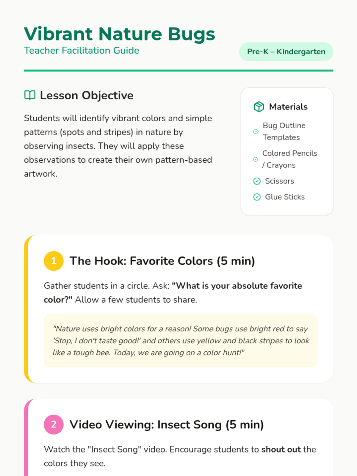 A detailed facilitation guide for teachers leading the Vibrant Nature Bugs lesson, featuring a timed breakdown of the hook, video observation, and art activity.