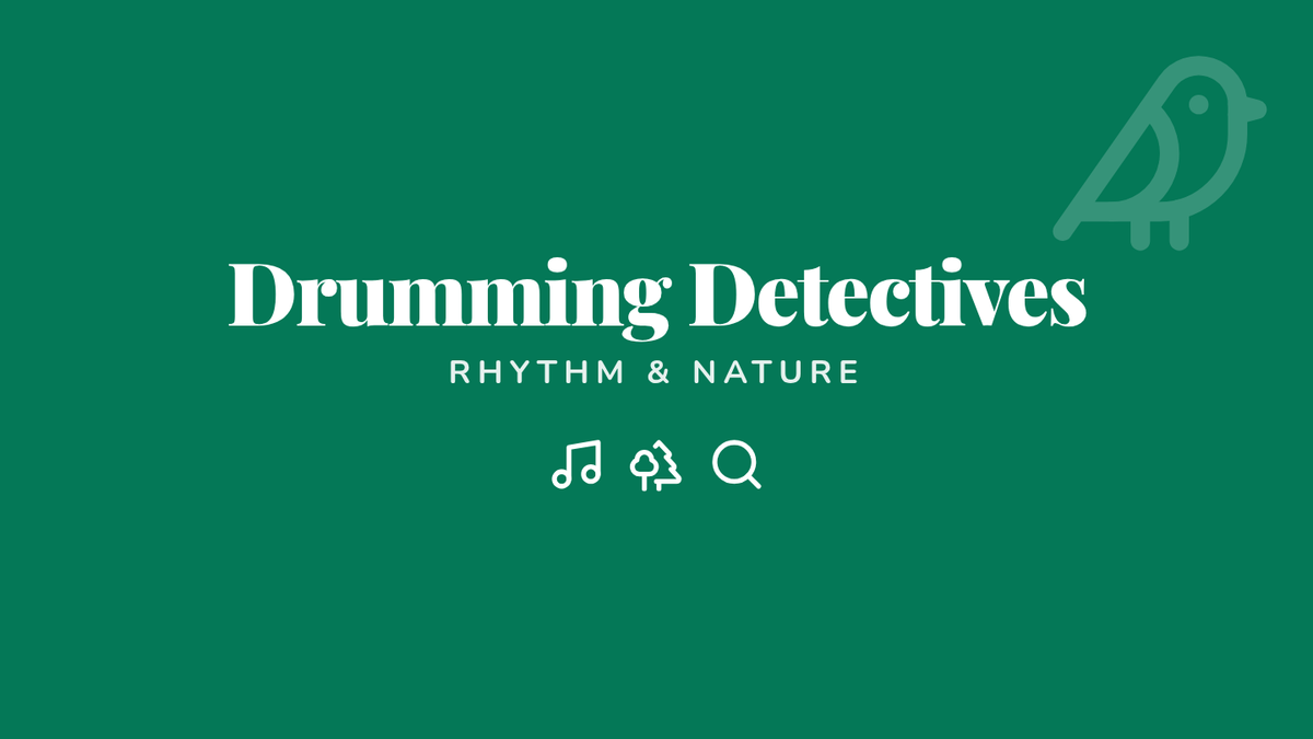 A visual presentation for the Drumming Detectives lesson featuring a mystery game, embedded video, science diagrams, and rhythm practice visual aids for kindergarteners.