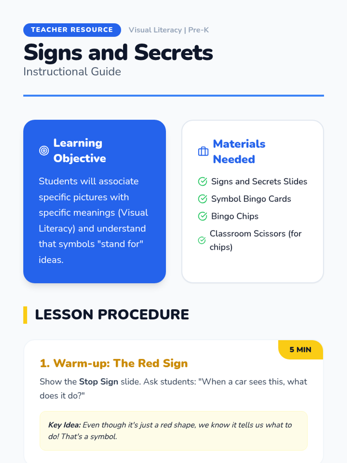 A comprehensive teacher facilitation guide for the "Signs and Secrets" lesson. Includes learning objectives, detailed procedure with video timestamps, discussion prompts, and Bingo calling instructions.