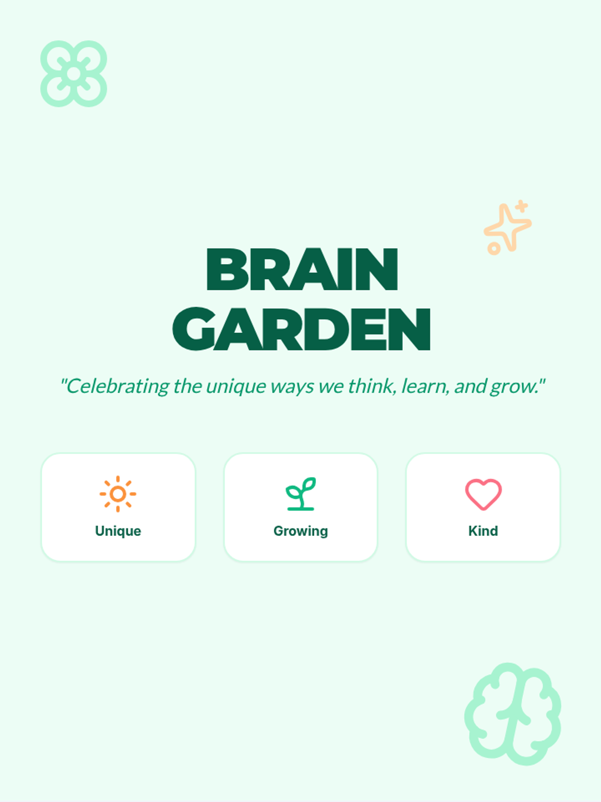 A multi-page printable bulletin board set titled 'Brain Garden' that celebrates neurodiversity through vibrant profiles of Autism, ADHD, Dyslexia, and Dyspraxia, emphasizing strengths and inclusive concepts.