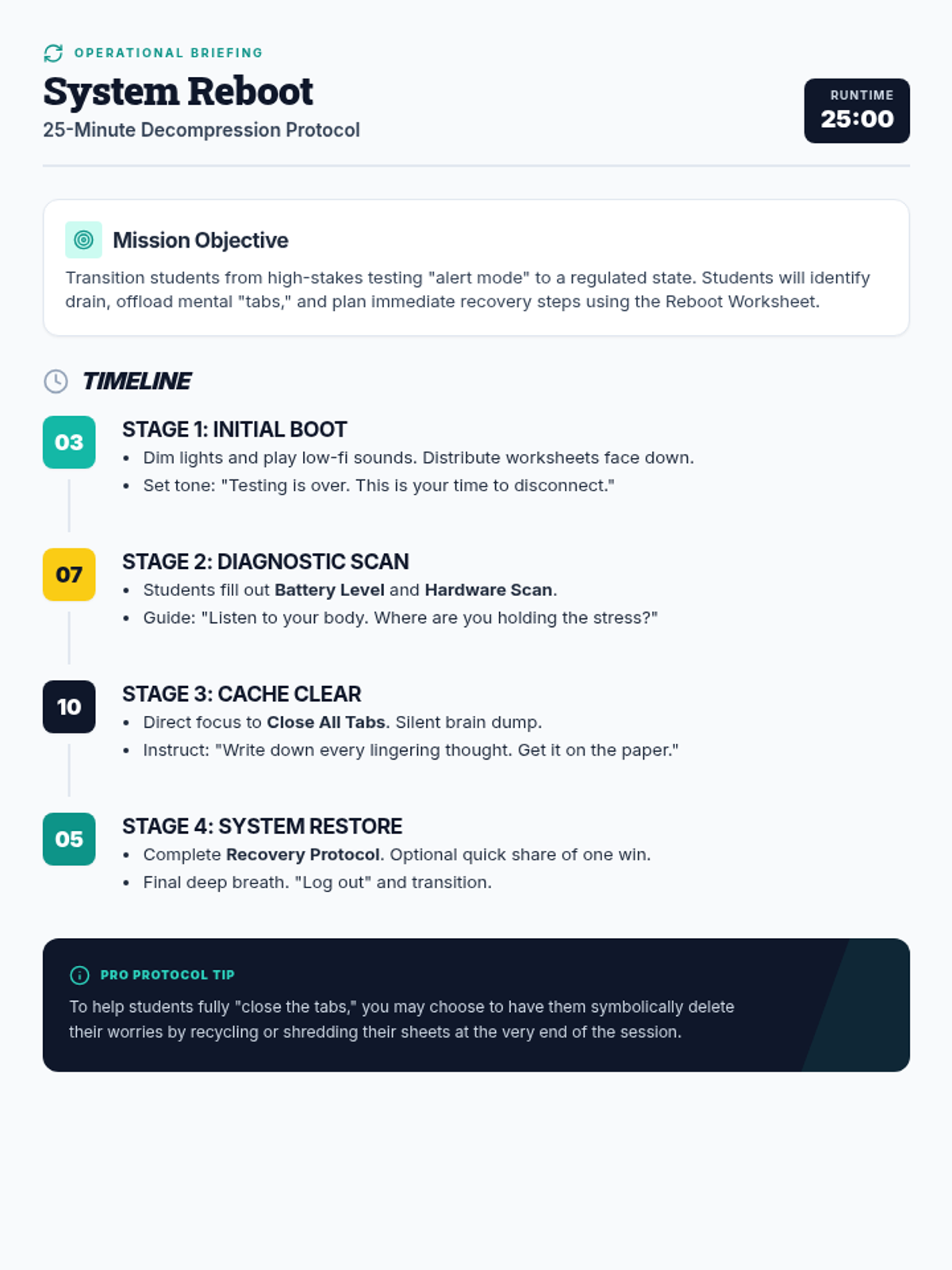 A concise, 25-minute lesson plan for the System Reboot session. Updated to remove the explicit instruction to not collect sheets, while maintaining the focus on student privacy and symbolic decompression.