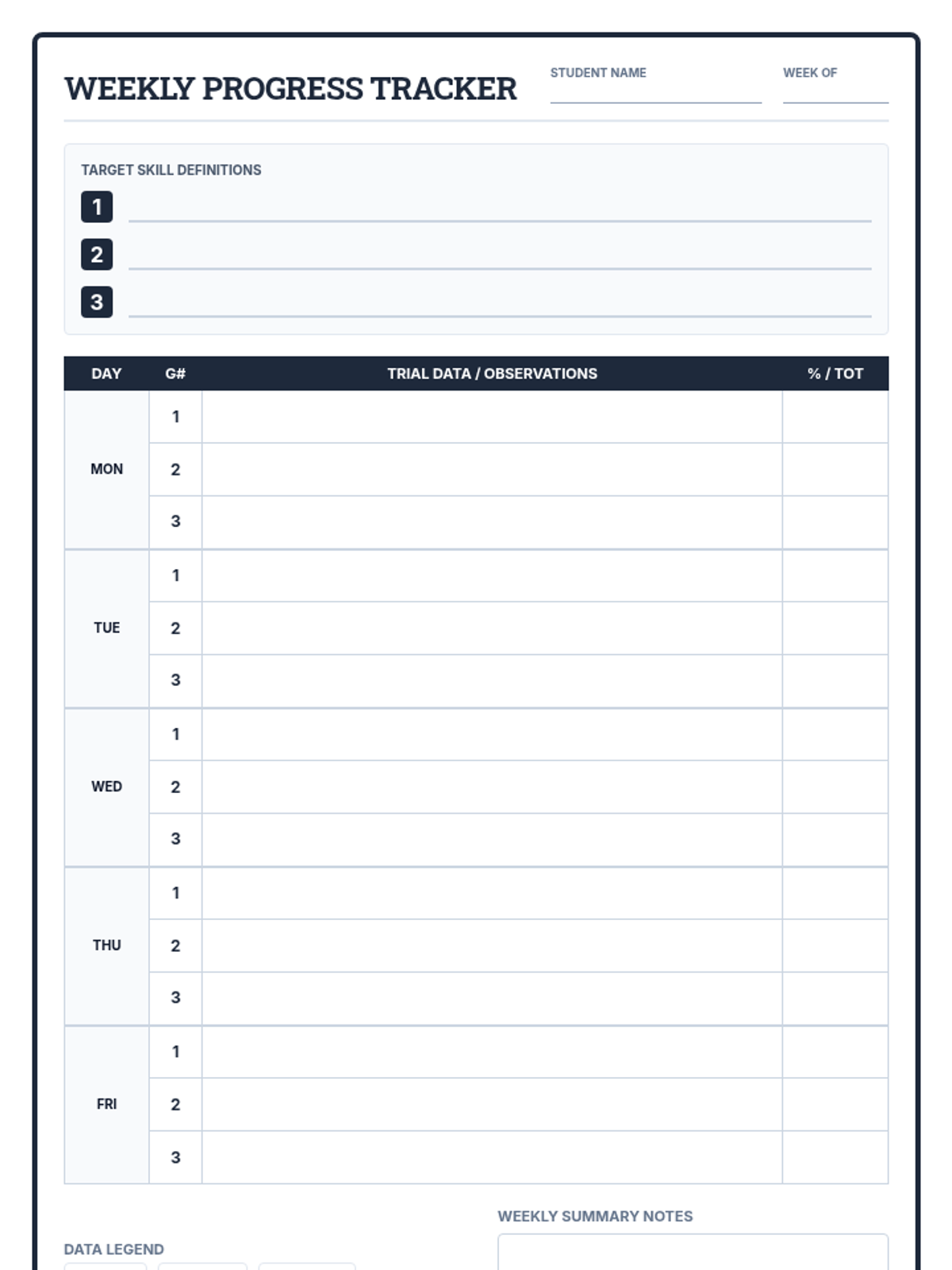 A multi-goal data collection document featuring weekly and monthly tracking. The weekly section supports up to 3 distinct goals with numbered rows, while the monthly section offers dual-tracking (Targets A & B) within a shared calendar grid.